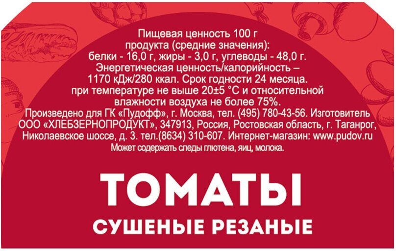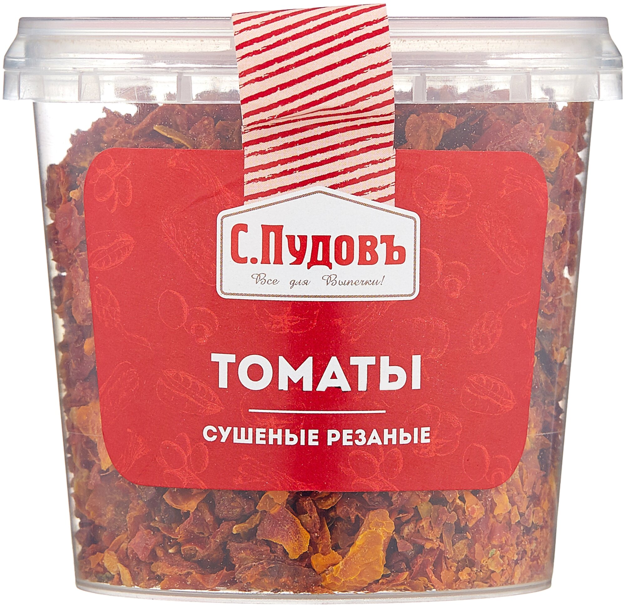 Томаты сушеные резаные «С. Пудовъ» - популярный ингредиент, который используется и как приправа, и как добавка, и как начинка.Сушеные томаты имеют яркий аромат, превосходящий даже некоторые сорта свежих томатов и томатной пасты. Кроме этого, сушеные томаты удобны в использовании: они могут хранится долго без потери качеств на обычной кухонной полке при комнатной температуре.Использовать сушеные резаные томаты можно практически в любых блюдах. Добавляйте их в тесто для хлеба, пирогов, фокаччо, чиабатту, несладкие начинки и начинку для пиццы. Они подходят для первых и вторых блюд, соусов и маринадов.Томаты сушеные резаные «С. Пудовъ» - 100% натуральный и качественный продукт. С ними всё будет вкусно!Состав: томаты сушеные резаные.Пищевая ценность 100 г продукта (средние значения): белки – 13,0 г, жиры – 0,4 г, углеводы – 75,0 г.Энергетическая ценность/калорийность: 1510 кДж/360 ккал.Срок годности: 24 месяца при температуре +20 + 5С и относительной влажности воздуха не более 75%.