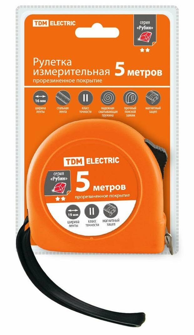Назначение:Для измерения длины предметов, расстояний, проведения разметочных работ.Применение:В быту: для установки мебели, декоративных элементов и т. д.В строительстве: для укладывания элементов конструкций, разметки и т. д.В промышленности: для установки и монтажа конструкций, прокладки кабеленесущих систем.Преимущества:функция автостоп – автоматическая фиксация выдвинутого измерительного полотна (в серии "Алмаз")Надежная сматывающая пружина и удобный корпус.Магниты для зацепления за металлические предметы и дополнительные зубцы в крючке (в серии «Рубин»).Прорезь в крючке для черчения окружностей (в серии «Гранит»).Дополнительное усиление заклепок крючка.Удобство и долговечность-прорезиненная вставка способствует хорошему захвату инструмента и надежно защищает корпус рулетки от повреждений при паденииУтолщенное пластиковое покрытие ленты, защищающее разметку.Удобный подвес для размещения в торговом зале, который содержит всю необходимую информацию о преимуществах продукта и типе отвертки, а также штрих-кодМатериалы:Сматывающий механизм - высококачественная пружинная сталь.ПВХЛента - высококачественная прокатная сталь с полимерным покрытием, защищающим от ржавчины.