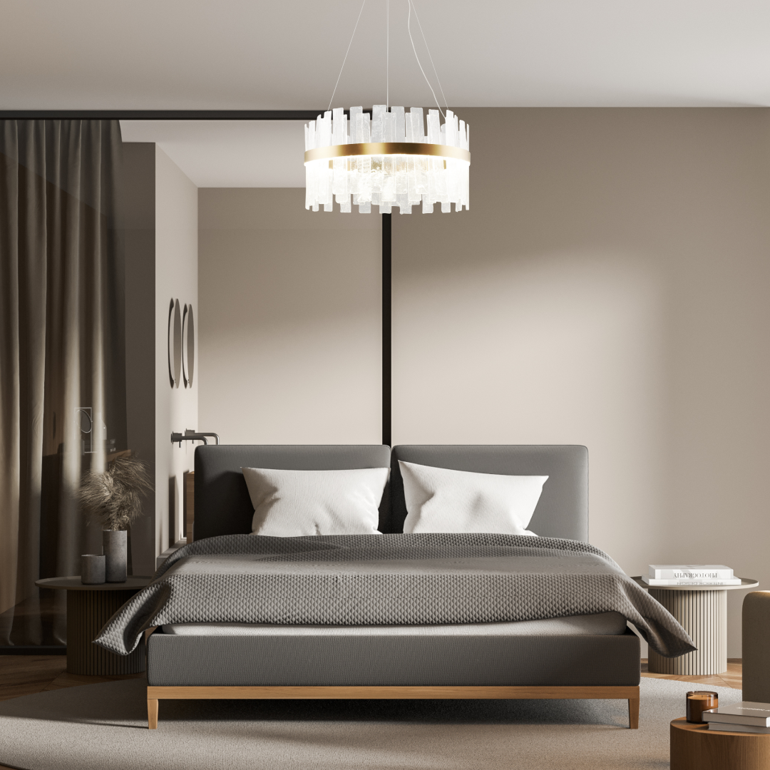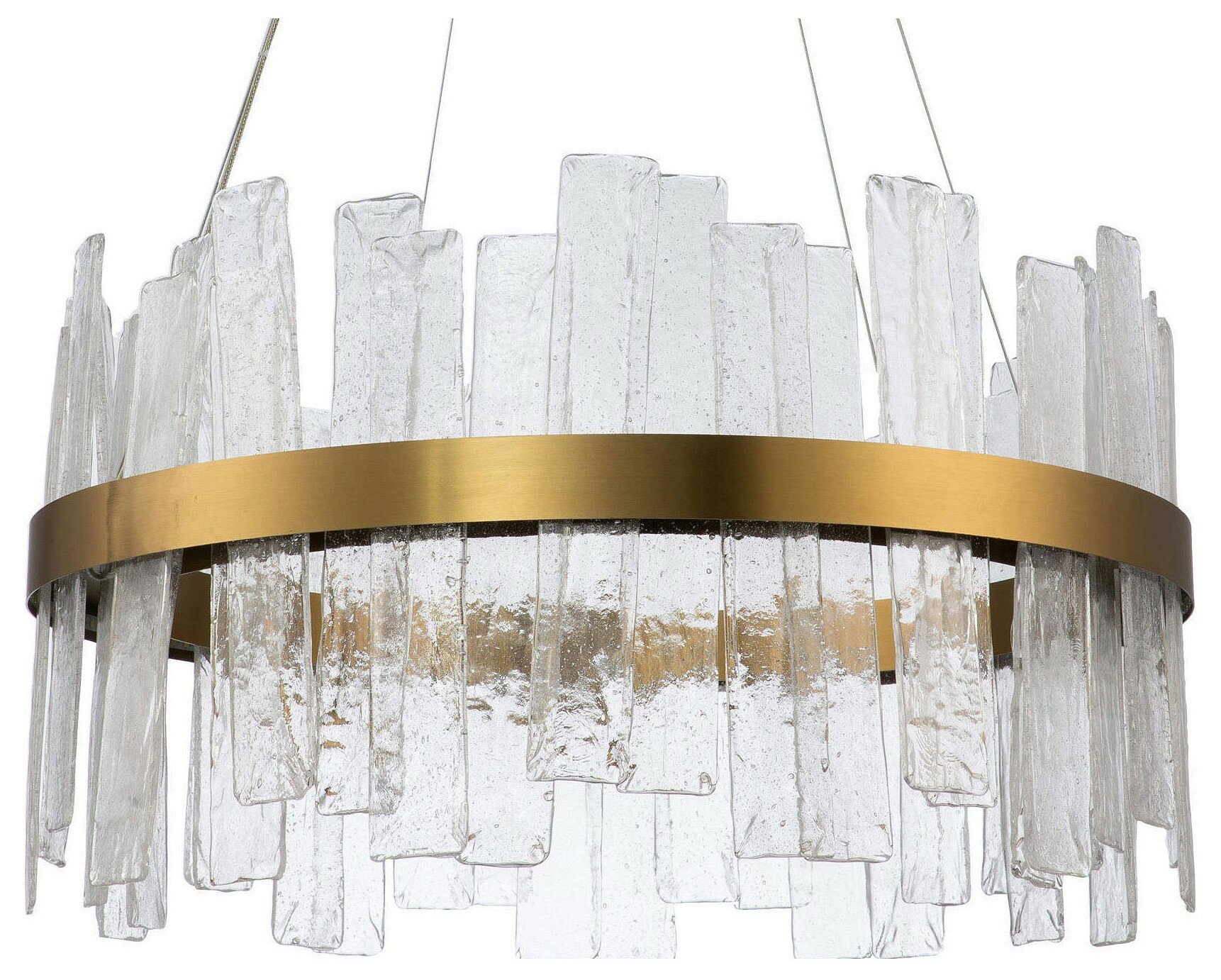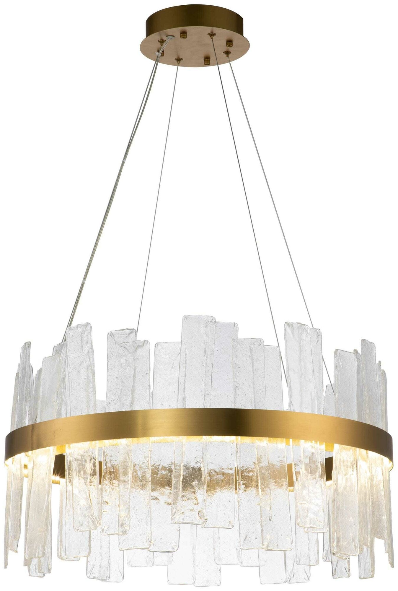 Современная подвесная люстра из серии Lima. Каркас золотого цвета дополнен вставками из матового стекла с эффектом льда. Простой и лаконичный дизайн люстры дополнит интерьер комнаты, а встроенные светодиодные ленты общей мощностью 60 Вт помогут создать качественное освещение. Общая высота люстры составляет 130 см, при монтаже с помощью подвесных тросов можно отрегулировать высоту по необходимости.