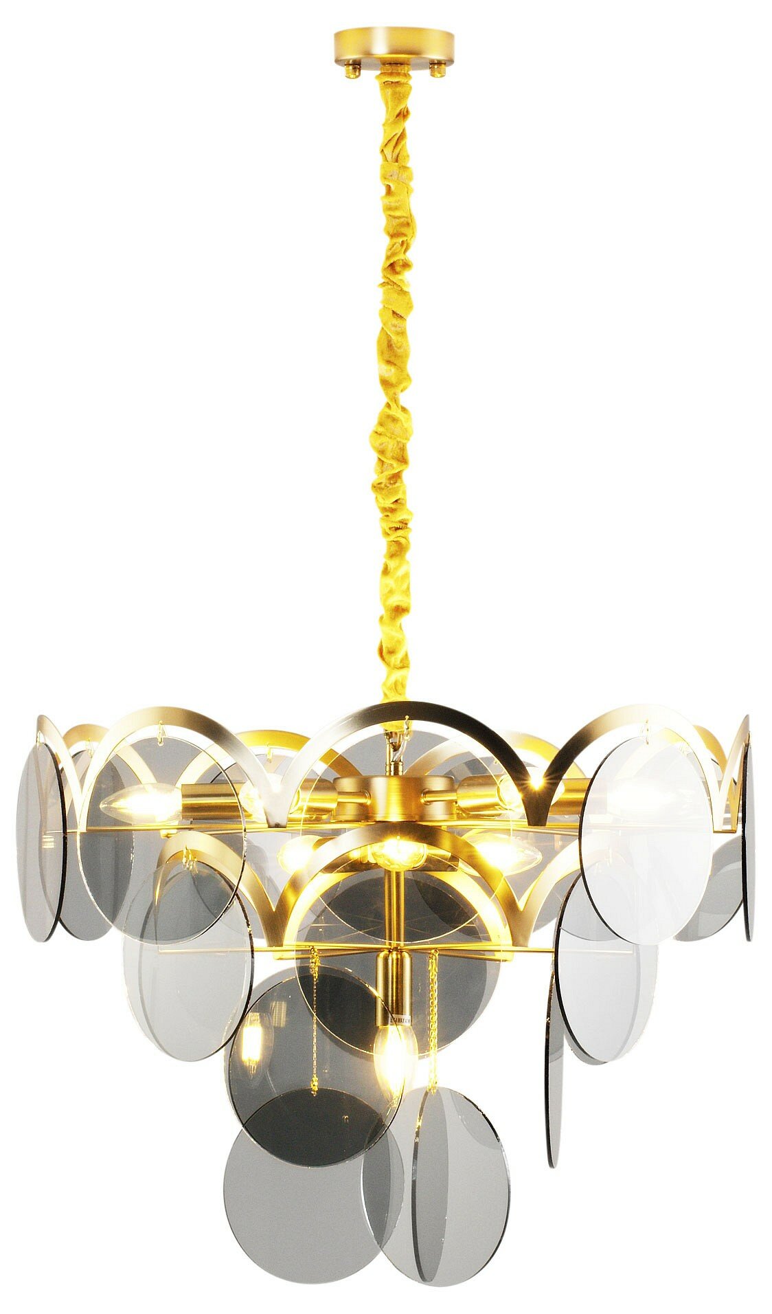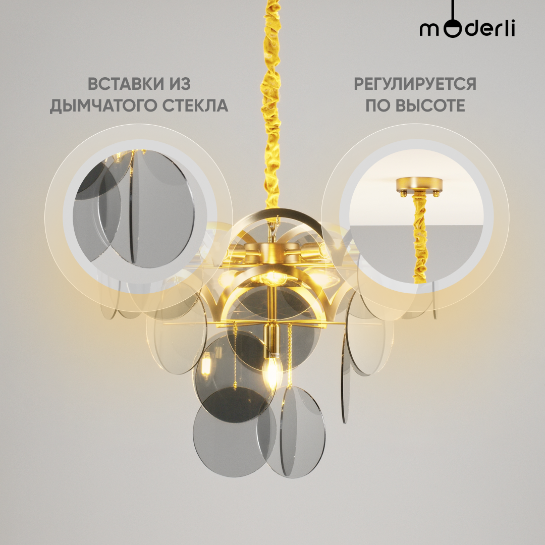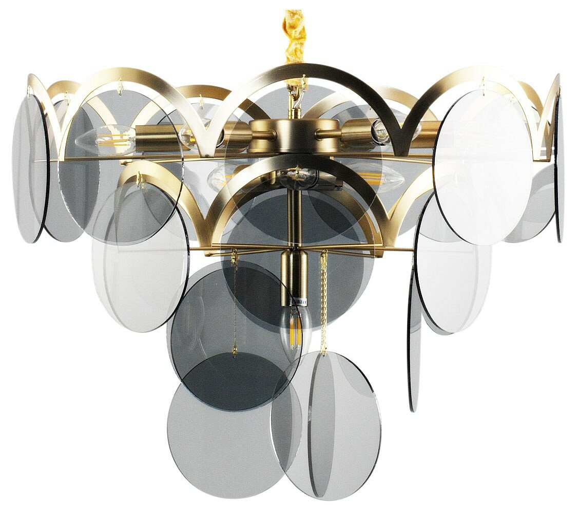 Современная подвесная люстра в стиле модерн. Каркас золотого цвета из плавных линий гармонично сочетается с круглыми вставками из дымчатого стекла. В качестве источника света подойдут лампы с цоколем Е14. Люстра крепится к потолку с помощью планки и удерживается цепью, которую при необходимости можно отрегулировать по высоте. Тканевый кожух поверх цепи снимается.