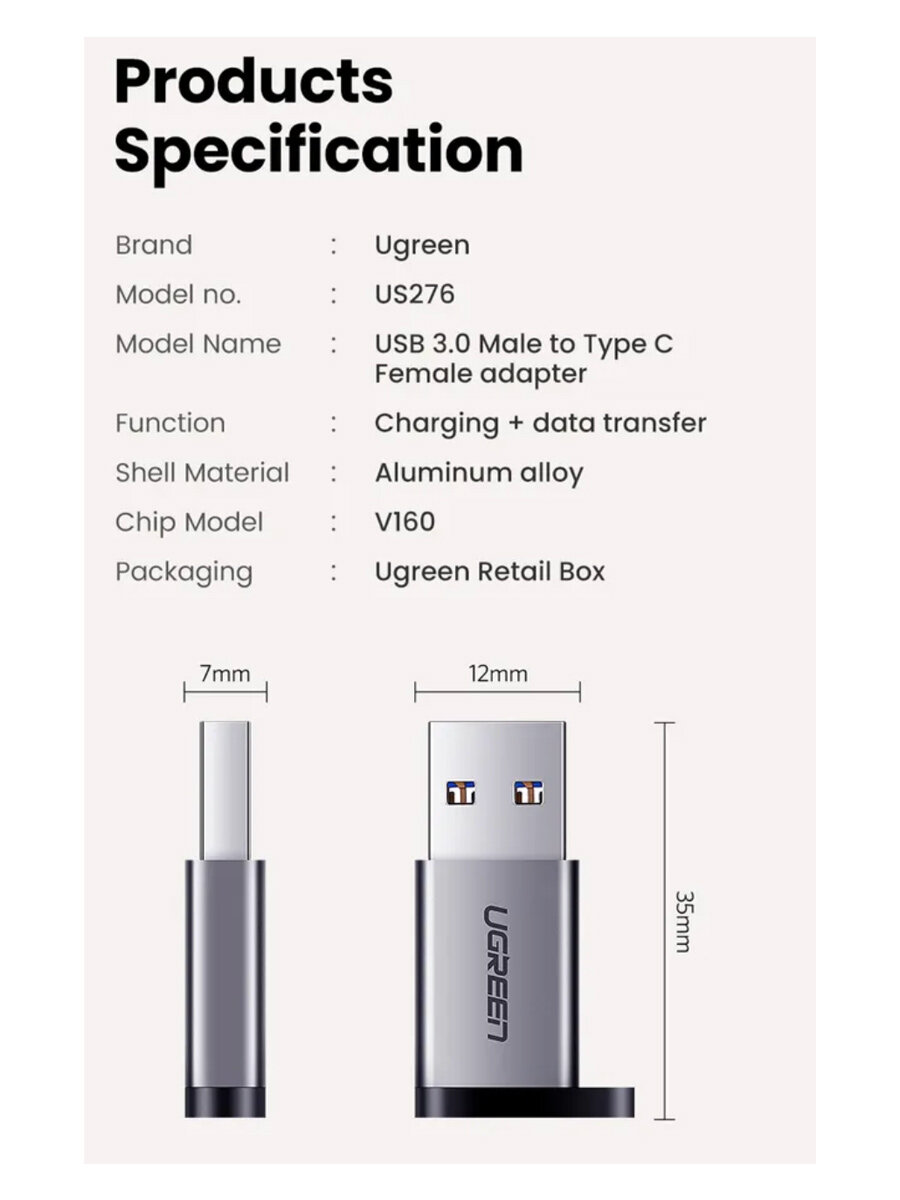 Адаптер UGREEN US276 (50533) USB 3.0-A to USB-C M/F Adpater серый