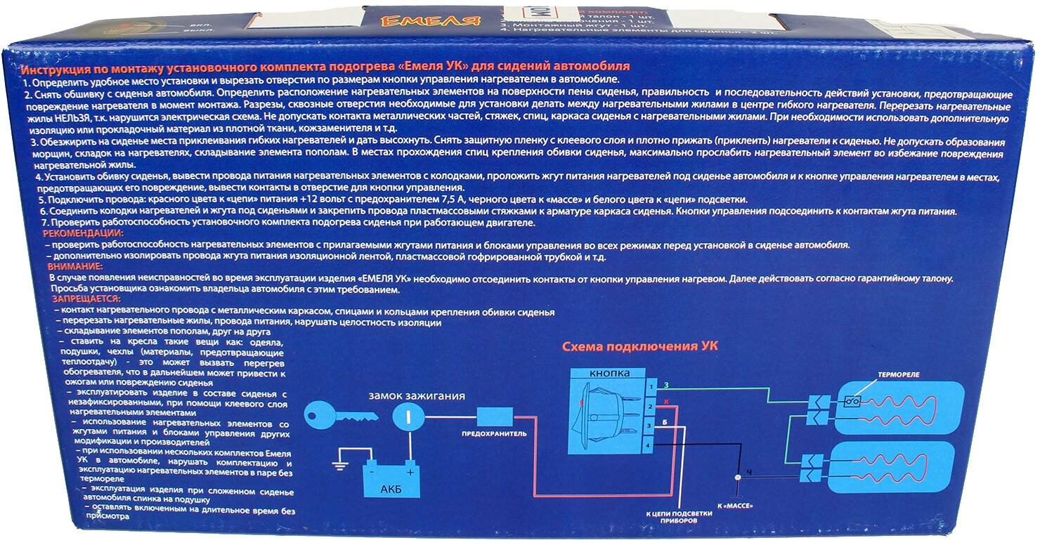 Размер: 37 x 32 см Потребляемая мощность: до 70 Вт Нагревательный элемент: провод Количество кнопок: 1 Установочный комплект подогрева сидений "Емеля УК-К" для стационарного монтажа под обшивку сиденья с термореле для защиты от перегрева. В комплекте 2 нагревателя c термодатчиком, трёхпозиционная кнопка управления с двумя режимами (интенсивный нагрев, комфортный нагрев), жгут монтажных проводов, инструкция по монтажу, гарантийный талон. В конструкции установочного комплекта применяется нагревательный провод, разработанный компанией "Теплодом". Комплект рассчитан на 1 сиденье.