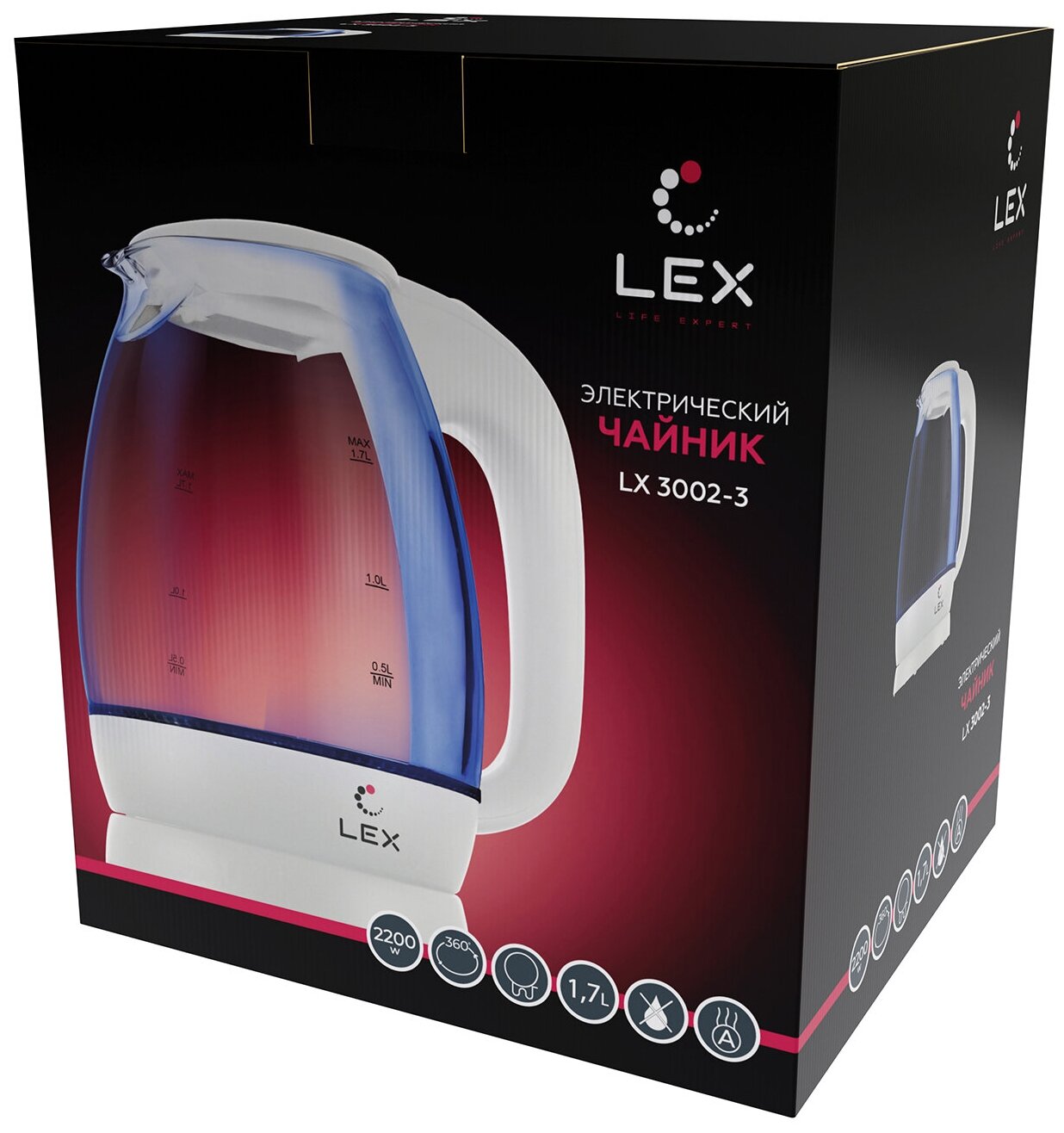 | Экологичность и стиль | LX 3002-3 изготавливается из безопасного термостойкого стекла. Крышка и ручка выполнены из экопластика, окрашенного в белый цвет, символизирующий чистоту, свет и уют. Во время кипячения внутренняя синяя подсветка эффектно окрашивает воду. |