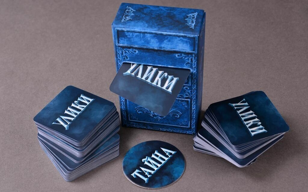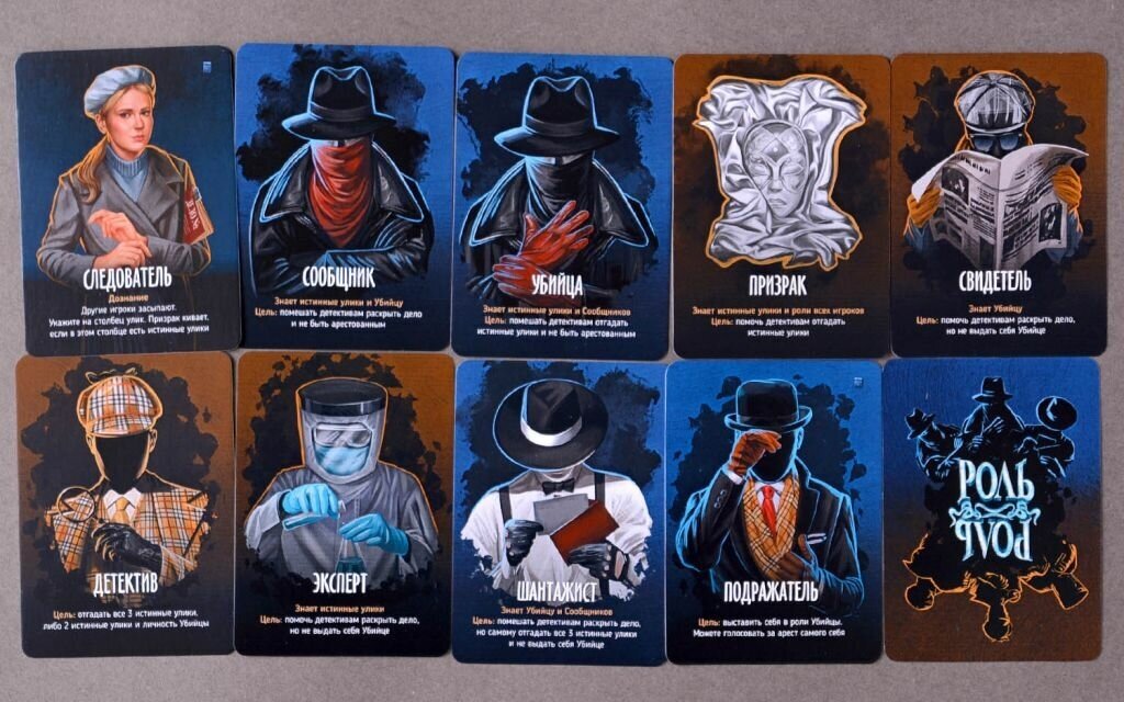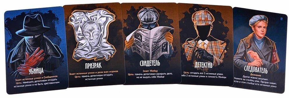 | Комплектация | 150 карт улик 63х63мм; 14 карт тайных ролей 63х89 мм; 12 карт персонажей (двусторонние); 3 жетона категорий; 1 жетон рации; 1 жетон почтового ящика; карта-памятка; правила игры |