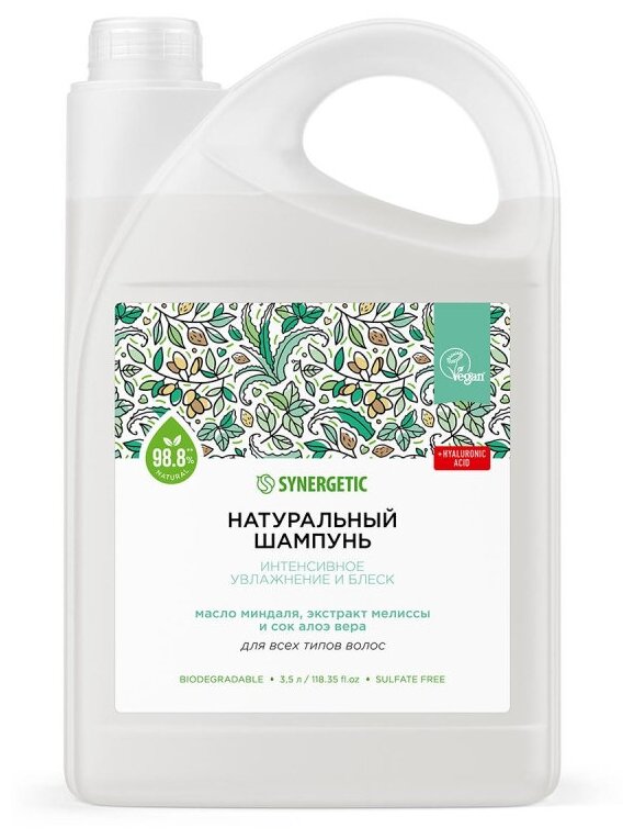 Бессульфатный шампунь SYNERGETIC «Интенсивное увлажнение и блеск» — эффективное средство для очищения кожи головы и всех типов волос — более чем на 98% состоит из натуральных компонентов.