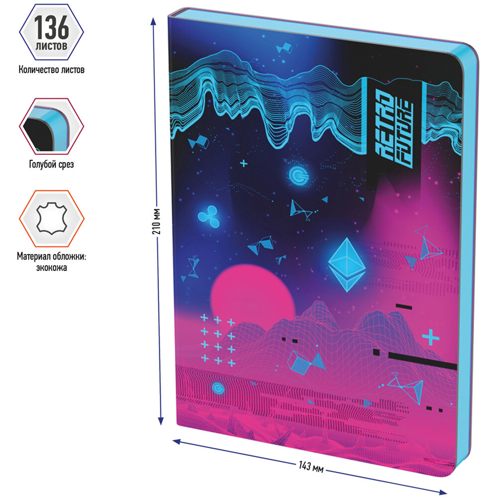 Стильный недатированный ежедневник Berlingo "Retro Future" формата A5 с ярким цветным контрастным срезом и ультрамягкой обложкой из высококачественной экокожи. Яркий дизайн коллекционной серии Berlingo "Retro Future". Внутренний блок состоит из 136 листов высококачественной кремовой бумаги повышенной плотности 80 г/м2 с пантонной печатью в 2 краски. Представлен в размере 143 на 210 мм.