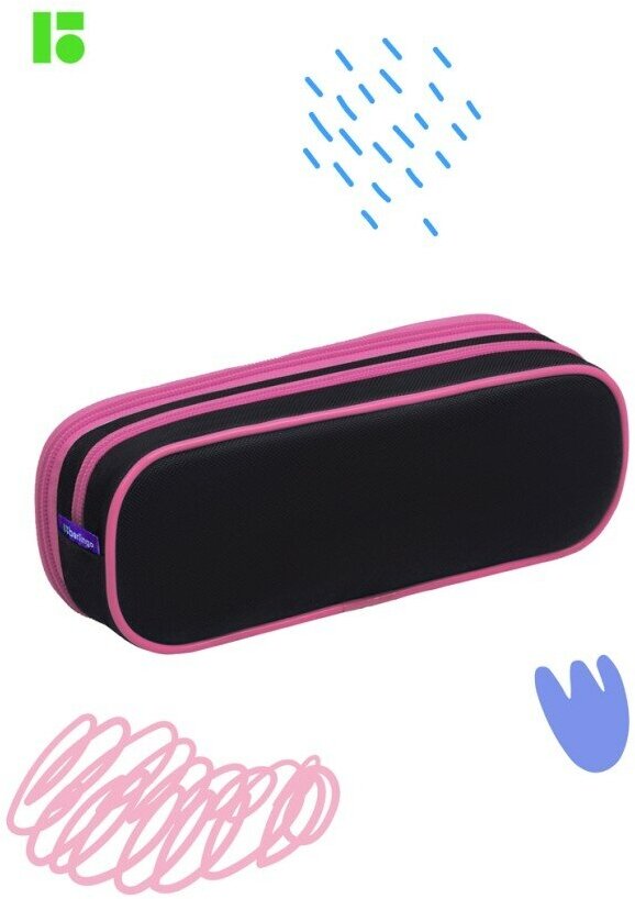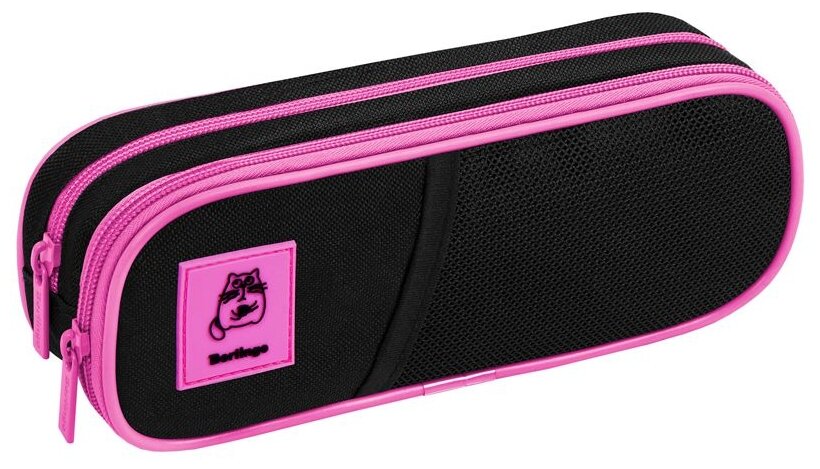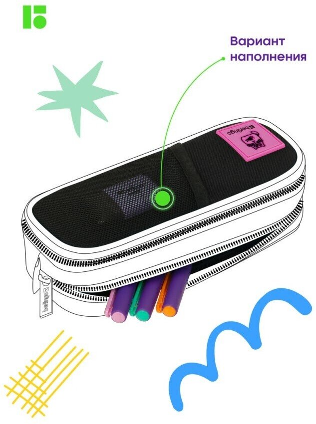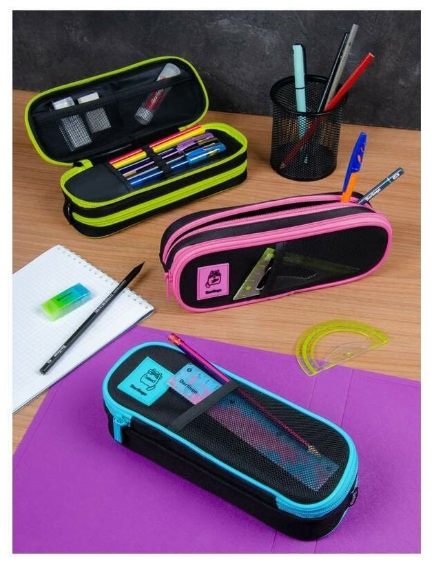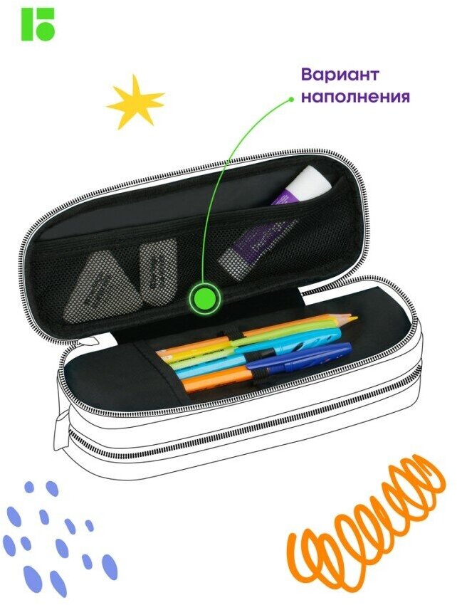 Пенал-футляр мягкий с 2 отделениями и карманом из сеточки на верхней крышке. Выполнен из полиэстера с контрастными молниями и забавными резиновыми нашивками в цвет молний. Внутри переднего отделения имеется 2 кармашка из сетки и резиночки-крепления для канцтоваров. Поставляется без наполнения.