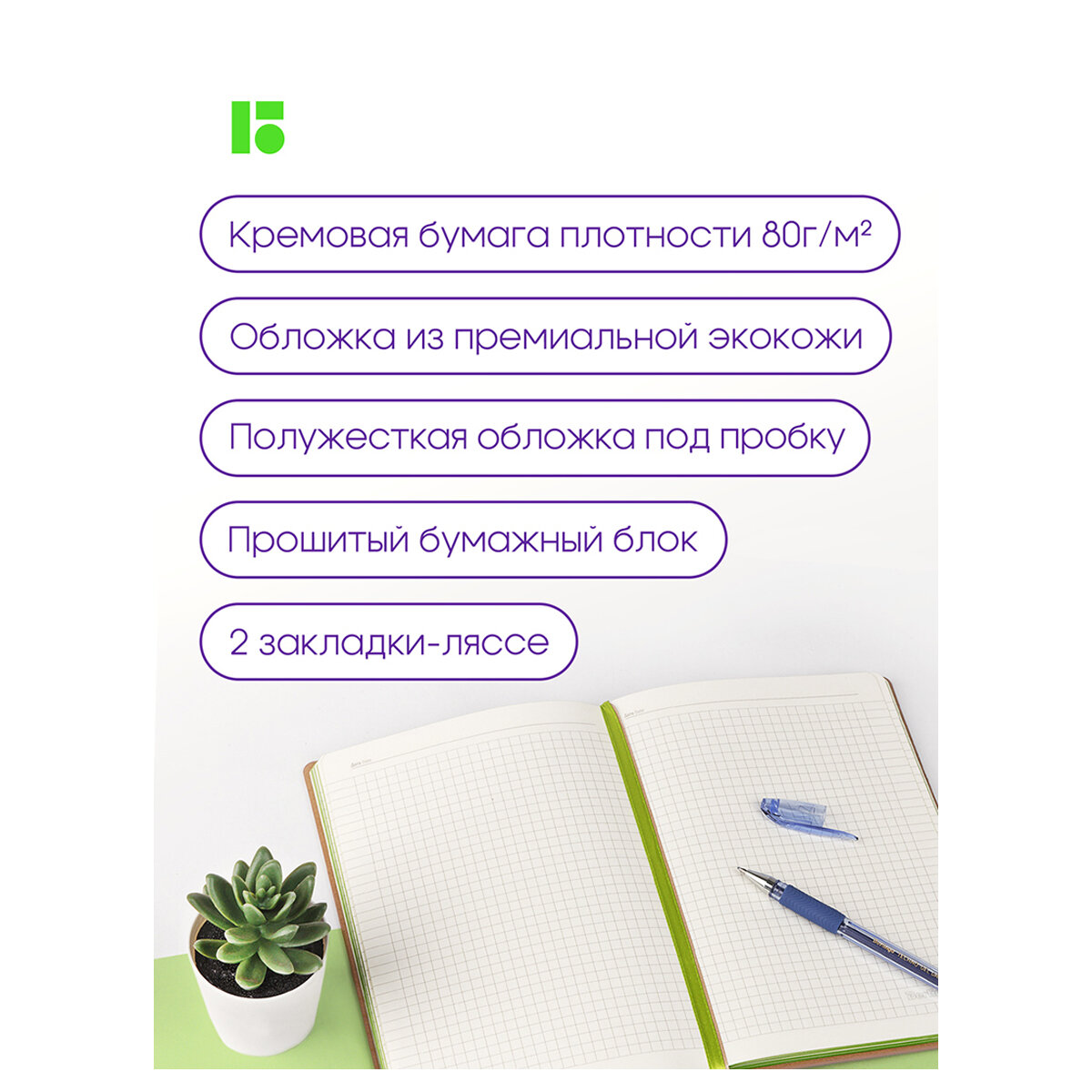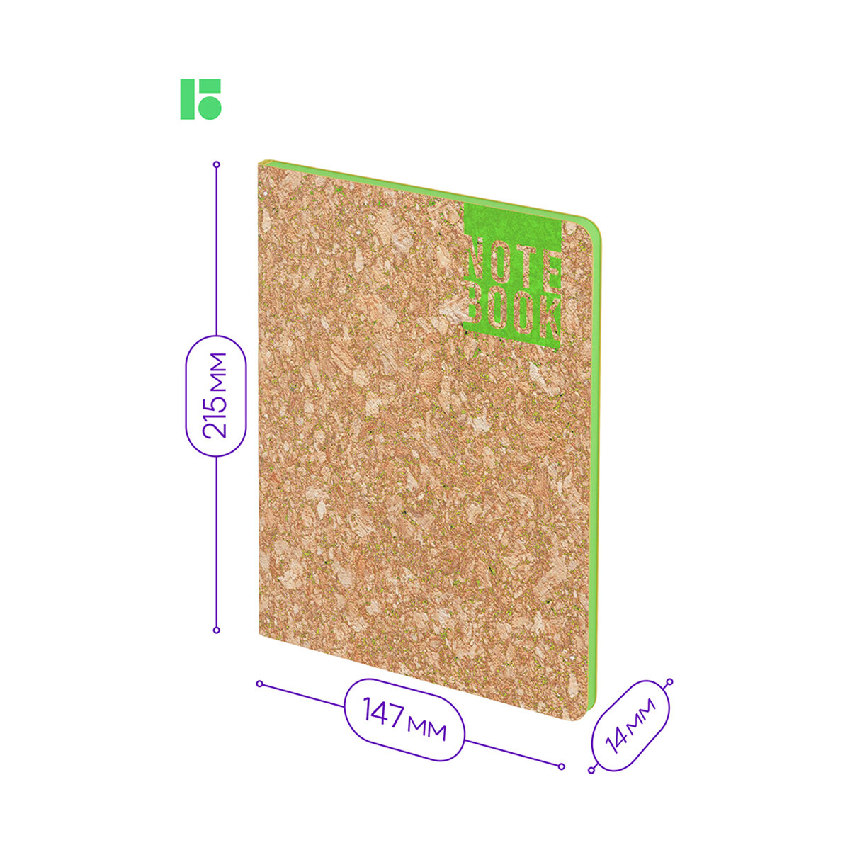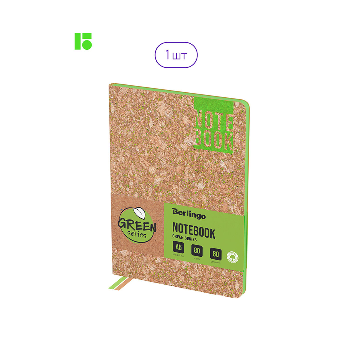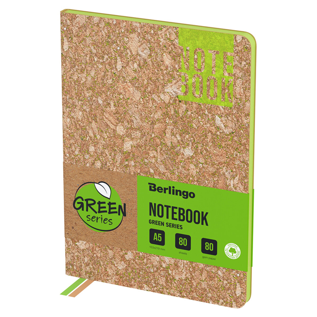 Записная книжка Berlingo "Green Series" формата A5 с зеленым контрастным срезом и обложкой из высококачественной экокожи стилизованной под пробковый материал. 1 рубль от продажи каждого продукта будет направлен на посадку деревьев. Полужесткая обложка. Внутренний блок состоит из 80 листов высококачественной кремовой бумаги повышенной плотности 80 г/м2 с пантонной печатью в 2 краски. Представлена в размере 143 на 210 мм.