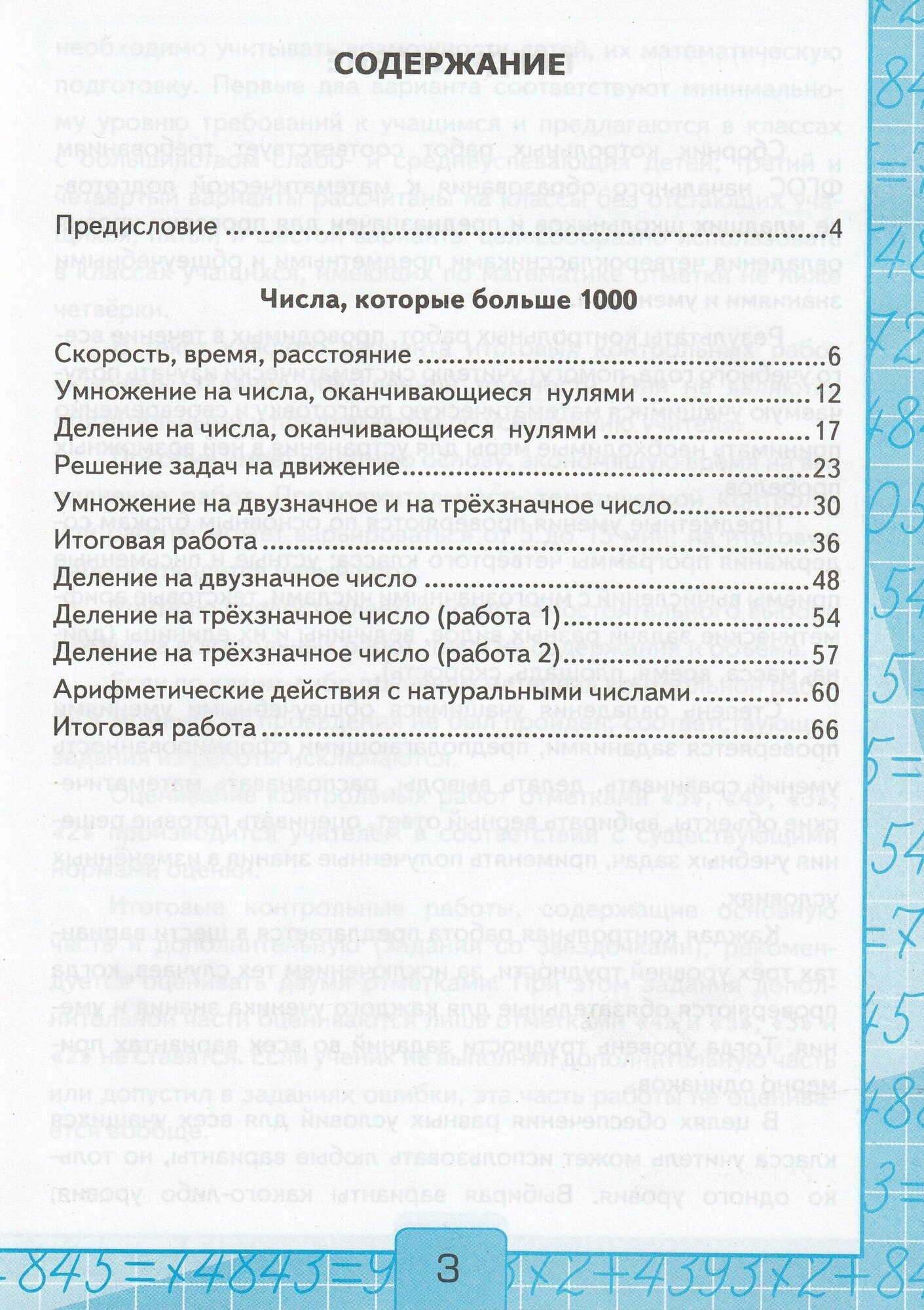 Пособие представляет собой сборник текущих и итоговых контрольных работ по математике к учебнику М. И. Моро и др. "Математика. 4 класс". Каждая контрольная работа дана в 6 вариантах.