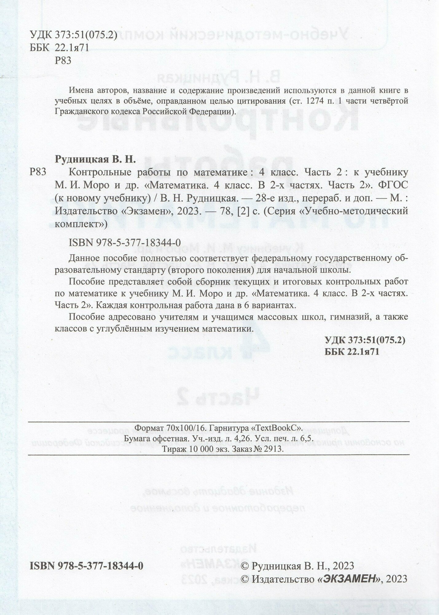 Контрольные работы по математике 4 класс Часть 2 К учебнику М И Моро и др Математика 4 класс В 2-х частях Часть 2 М Просвещение (Виктория Наумовна Рудницкая); Экзамен, 2025