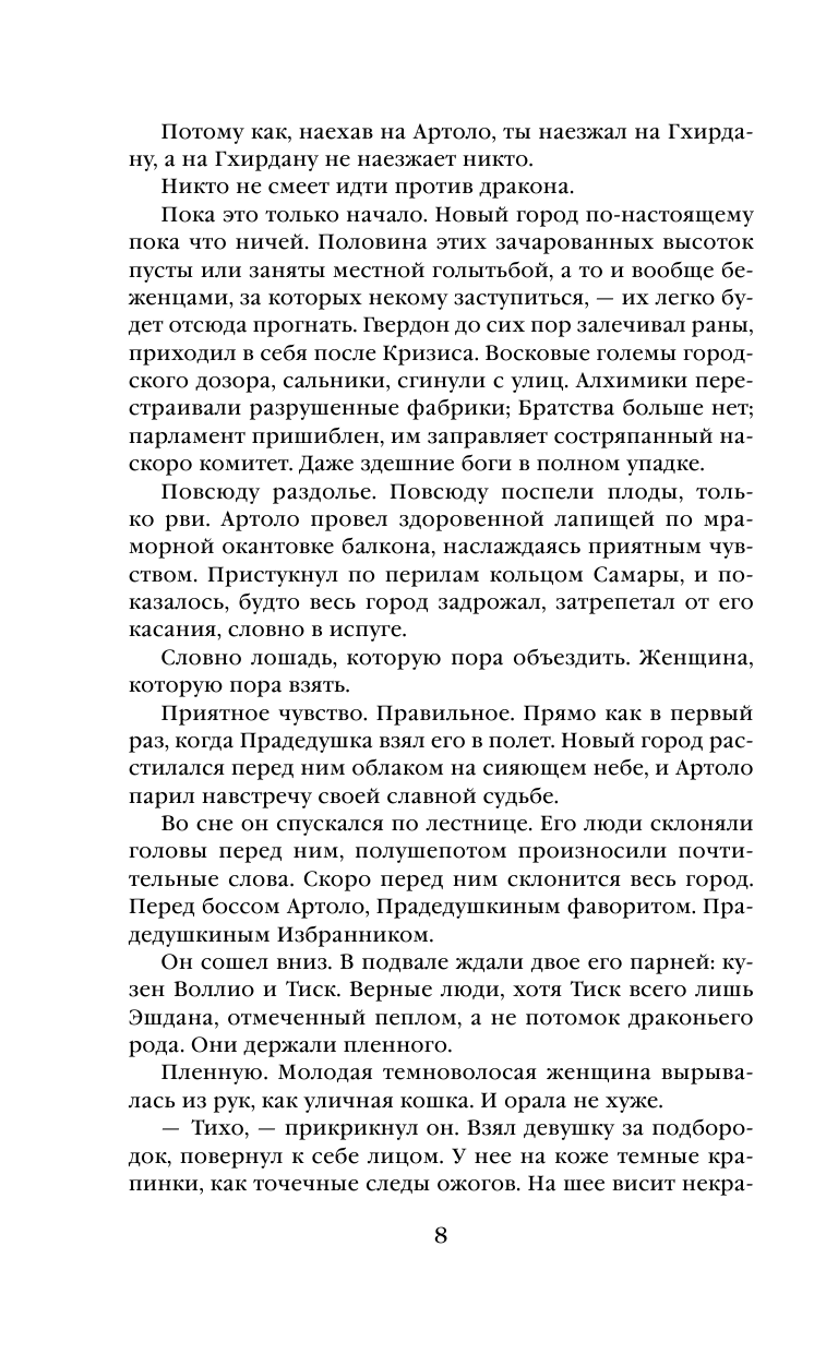 Очень яркий роман, много событий, поворотов, образов и идей. Отлично продолжает и подхватывает линии предыдущих романов, но вводит в историю новых героев, новые территории и имеет свой выраженный финал. Мне нравится история Гвердона, новые роли старых героев и то, что автор не забывает подвести логику под все происходящее. История не очень быстрая, зато пробирает до костей, и, когда события закручиваются, это похоже на калейдоскоп безумных темных чудес, тайн прошлого и, конечно, богов. Действительно ни на что не похожее фэнтези!
