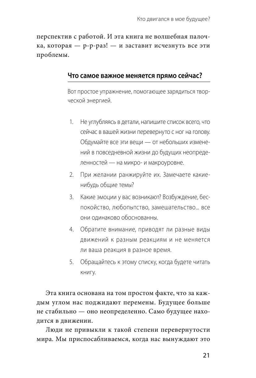 Читатели смогут выработать новый взгляд на перемены, найти новые ответы и, в конечном счете, изменить свое отношение к происходящему. Эта книга поможет каждому: и тем, кто находится на новом витке карьеры, и тем, кто переоценивает ценности, и тем, кто разрабатывает продукт, начинает собственный бизнес, пытается вдохновить своих коллег или стремится к более полной самореализации и желает преуспеть, несмотря на то что почва слишком часто уходит из-под ног.