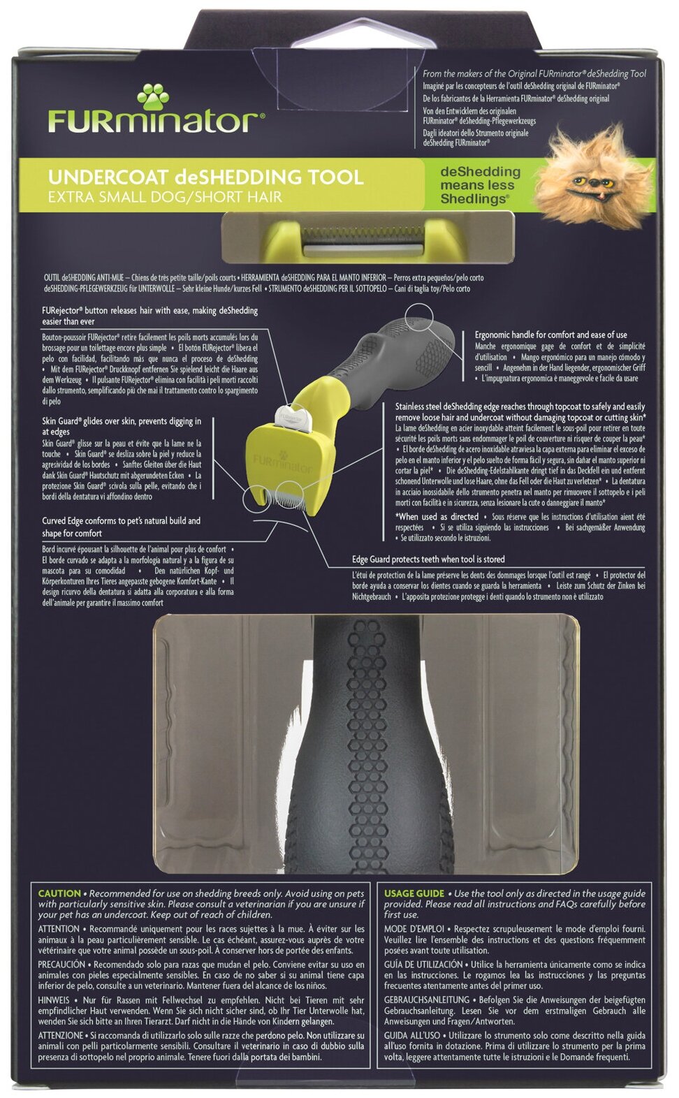Инструмент FURminator (Фурминатор) XS - 25 мм (длина рабочей поверхности). Отлично подойдет для карликовых собак с короткой шерстью. Уникальное лезвие захватывает и вытаскивает мертвые волоски подшерстка до их выпадения, сокращая линьку до 99%. Инструмент экономит ваше время, сохраняет здоровье кожи и шерсти, не повреждает остевой волос. Вы забудете о выпавшей шерсти на полу, одежде и мебели. Кнопка самоочистки легко сбрасывает шерсть с инструмента. Защелкните ее для защиты в процессе хранения. Защитные края предупреждают давление на кожу.. Инструкция: Вычёсывайте животное, проводя инструментом по направлению роста волос, проникая лезвием вглубь шерсти животного. Не задерживайтесь надолго в одной области. Удалите шерсть с инструмента путём нажатия на кнопку самоочистки.