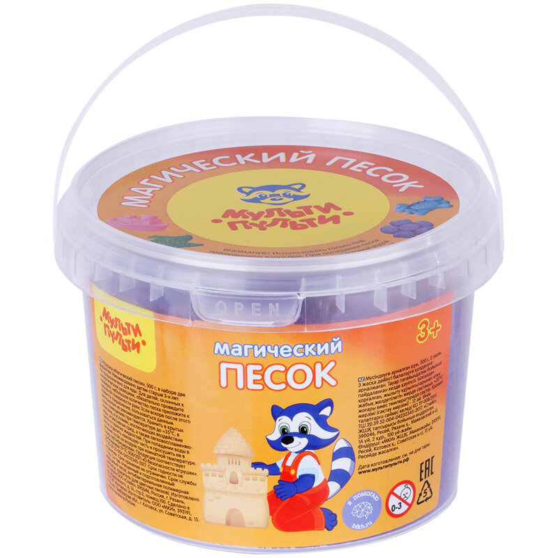 Песок для лепки «Мульти-Пульти» серия «Магический песок» весом 500 граммов в пластиковом ведре. В состав набора входят две формочки для лепки. Цвет – морской. Магический песок обладает кинетическим эффектом и достаточно пластичен, не сохнет, хорошо держит форму и лепится с помощью формочек или просто руками. Подходит для детей старше трёх лет.