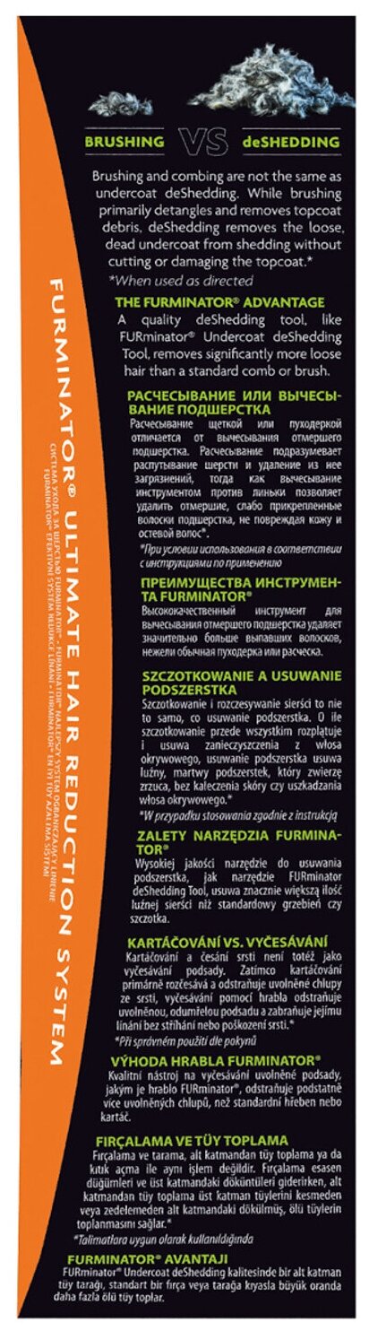 Инструкция: Вычёсывайте животное, проводя инструментом по направлению роста волос, проникая лезвием вглубь шерсти животного. Не задерживайтесь надолго в одной области. Удалите шерсть с инструмента путём нажатия на кнопку самоочистки.