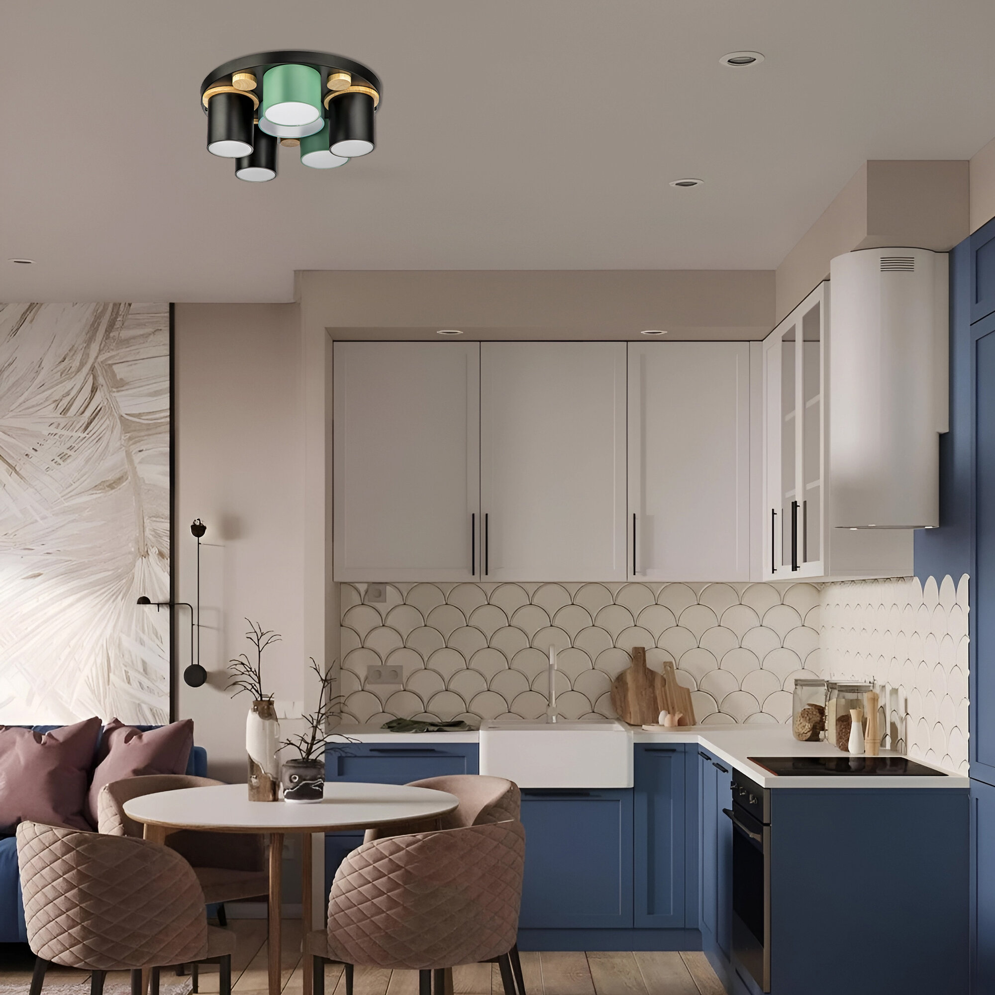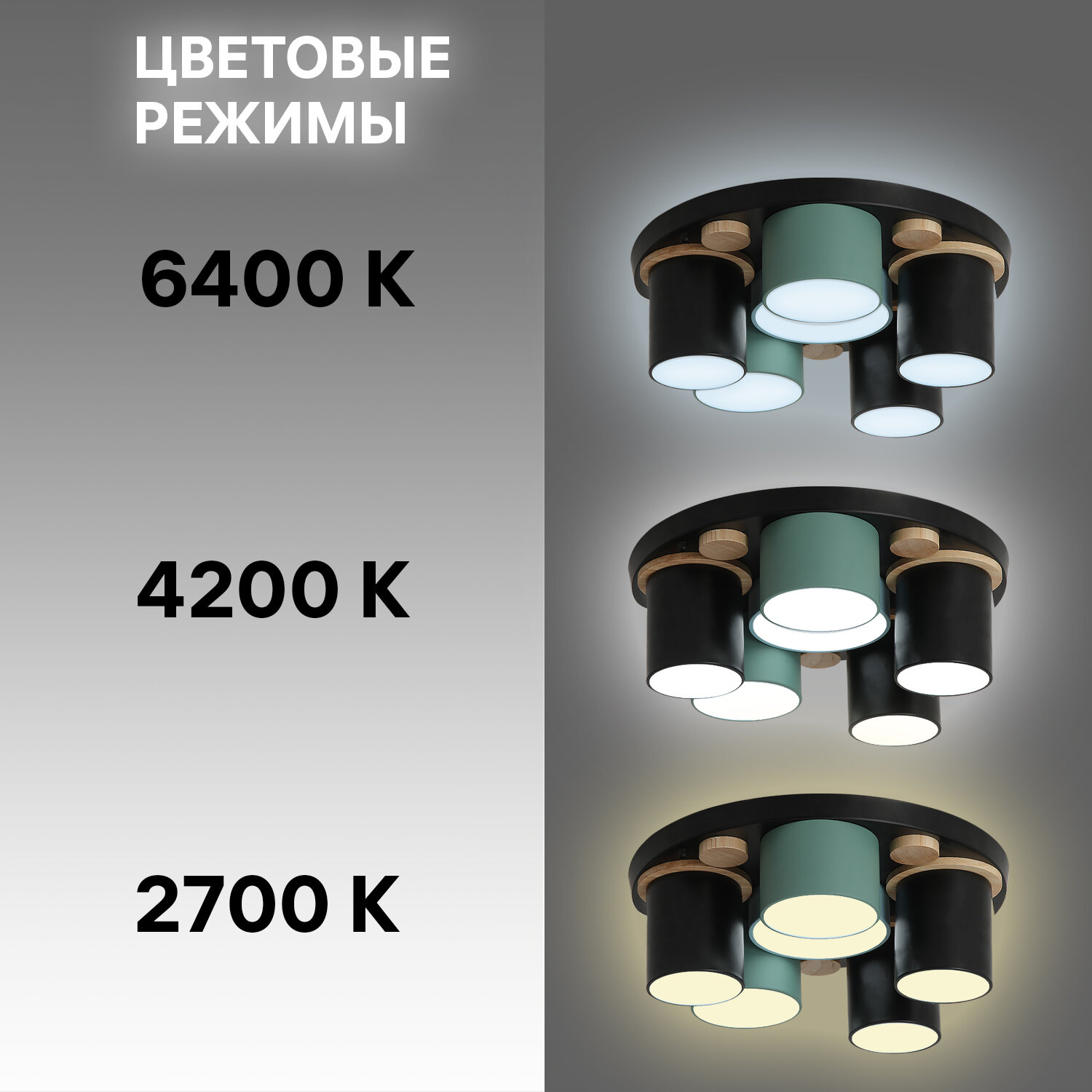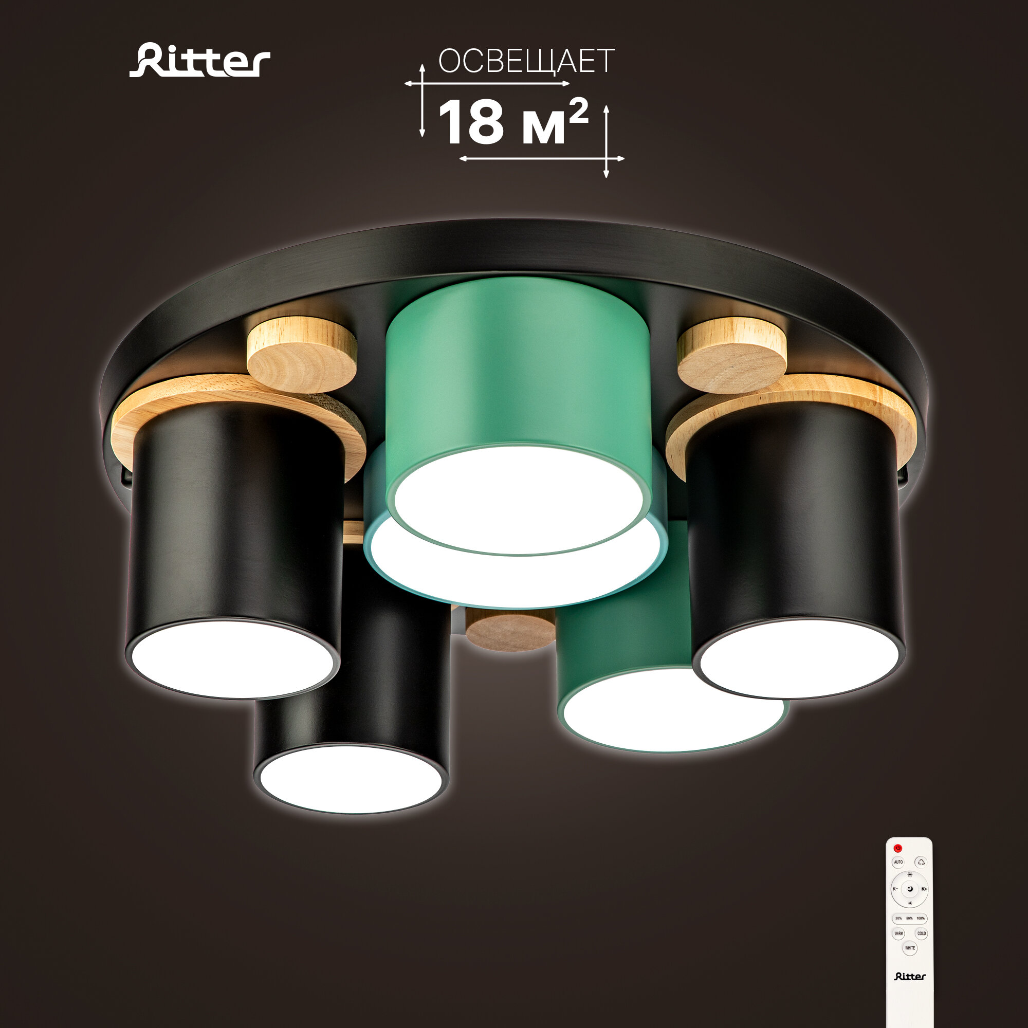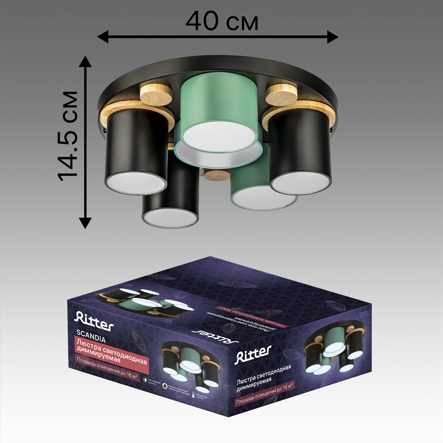 Светодиодная потолочная люстра серии SCANDIA от немецкого бренда Ritter - отличный выбор для любых помещений площадью до 18 кв. м. Люстра серии SCANDIA имеет в основании чёрный металлический круг с деталями из натурального дерева. Шесть цилиндрических плафонов зелёного, голубого и чёрного цветов сформируют стилистическую композицию. Плафоны различаются по диаметру и расположены на разной высоте, что создает ощущение домашнего комфорта и уюта. Предусмотрена возможность изменения режима цветовой температуры при помощи пульта. Остаётся только подобрать место, и светильник серии SCANDIA сам создаст атмосферу перфекционизма в вашем доме или офисе.