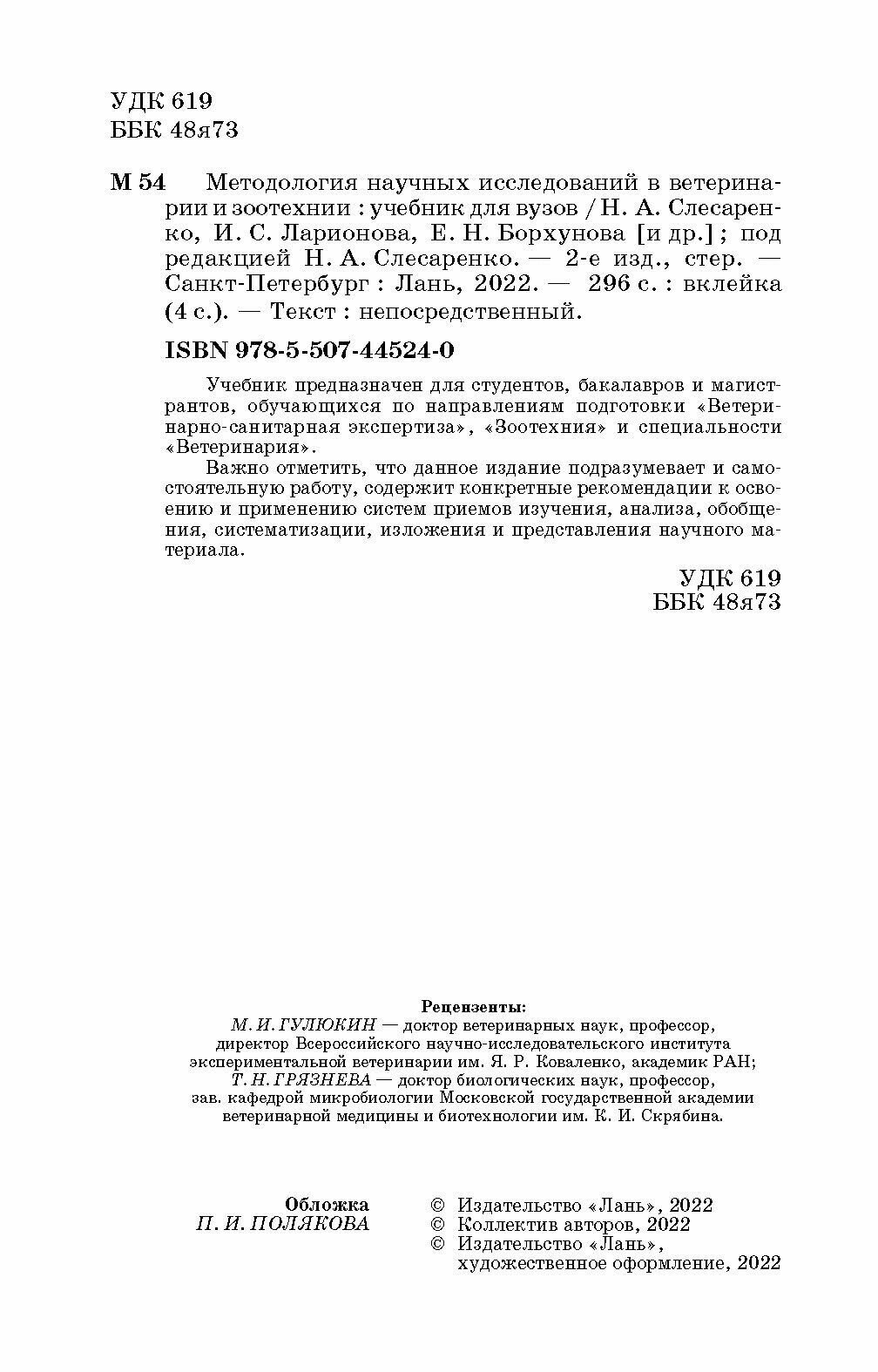 Методология научных исследований в ветеринарии и зоотехнике. Учебник (Слесаренко Наталья Анатольевна, Борхунова Елена Николаевна, Ларионова Ирина Сергеевна); Лань, 2020