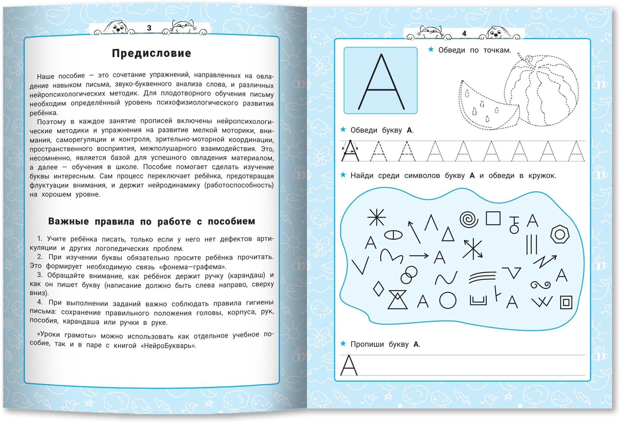 Прописи "Уроки грамоты" - универсальное практическое пособие для занятий с дошкольниками, которое может использоваться в качестве приложения к книге И. И. Праведниковой "НейроБукварь".
