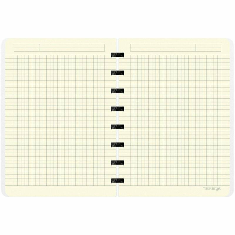Увеличенная толщина обложки (700мкм). Белый цвет внутренней поверхности. Материал обложки - полипропилен, защищает внутренний блок от влаги, замятия и загрязнения, обложка устойчива к загрязнениям. Вид скрепления - стильные имиджевые черные кольца, с возможностью раскрывать тетрадь на 360%. Возможна замена бумажного блока и быстрая и удобная выемка/вставка листов без повреждений.