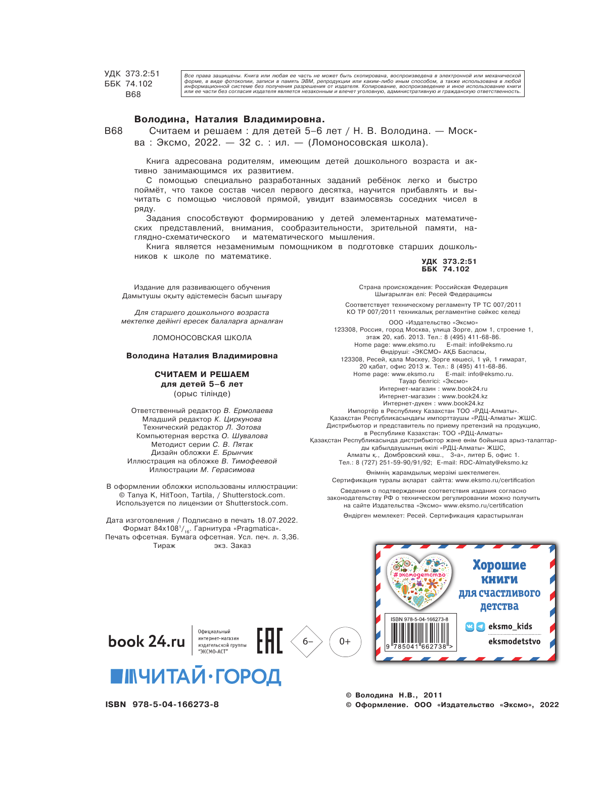 Сервис сравнения цен СкидкаГИД предлагает сравнить цены на товар «Книга: Считаем и решаем: для детей 5-6 лет (Володина Наталья Владимировна); ООО "Издательство "Эксмо", 2022»