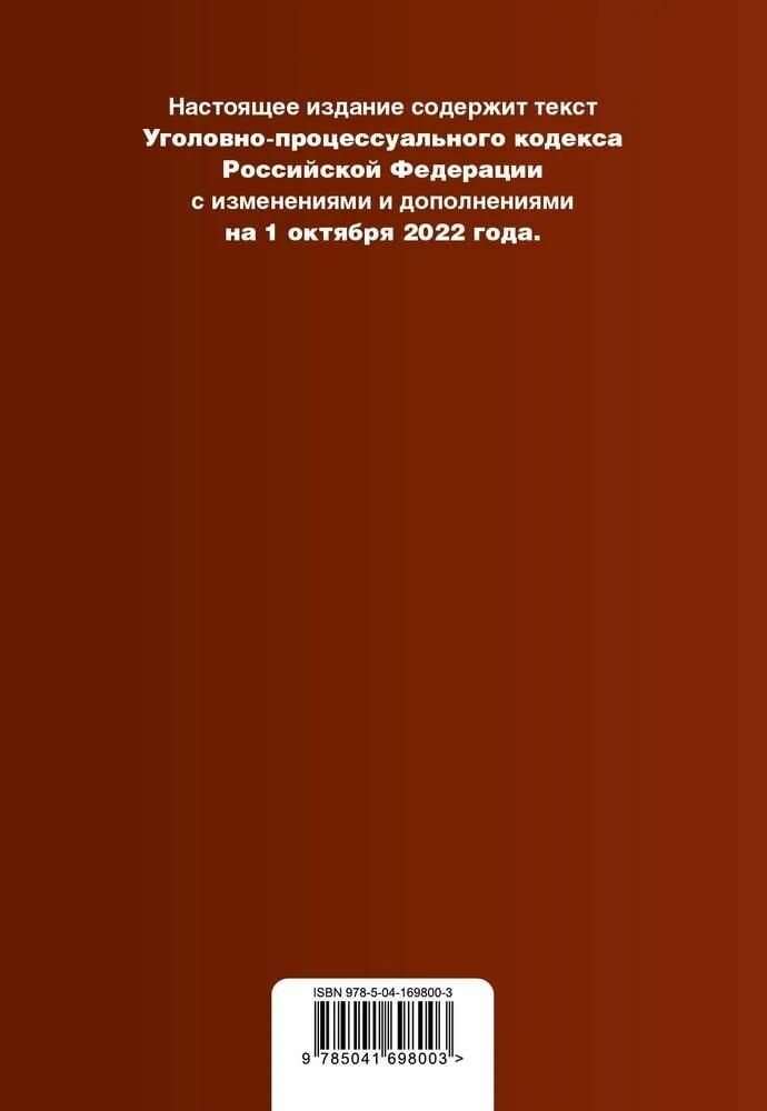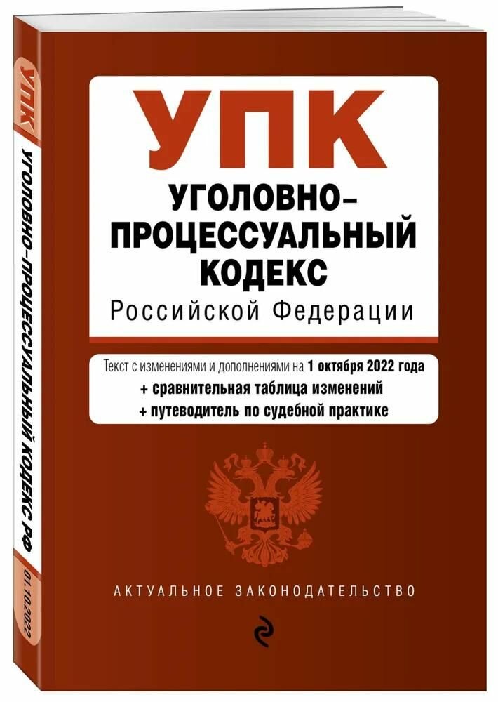 Настоящее издание содержит текст Уголовно-процессуального кодекса Российской Федерации с изменениями и дополнениями на 1 октября 2022 года с удобной навигацией, таблицей изменений и путеводителем по судебной практике. Если есть изменения, вступающие в силу позднее, то вместе с редакцией нормы, действующей на эту дату, приводится норма в новой редакции и указывается дата, с которой она вступает в силу.