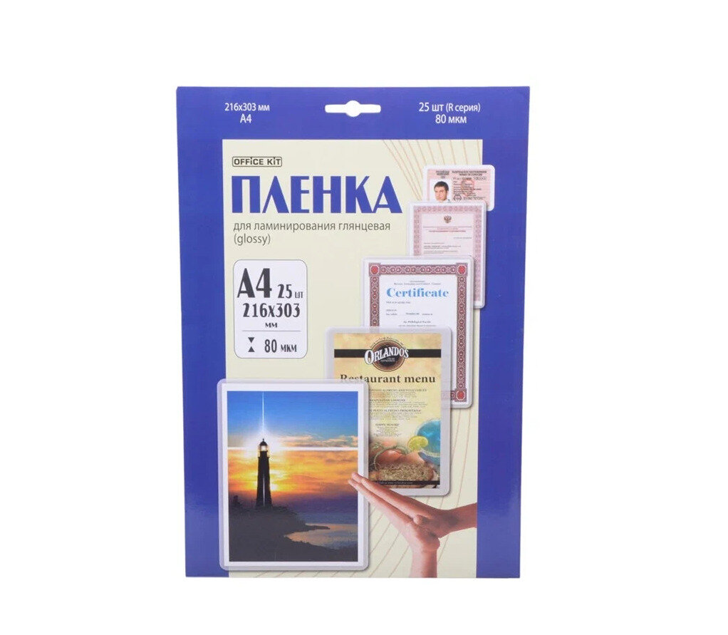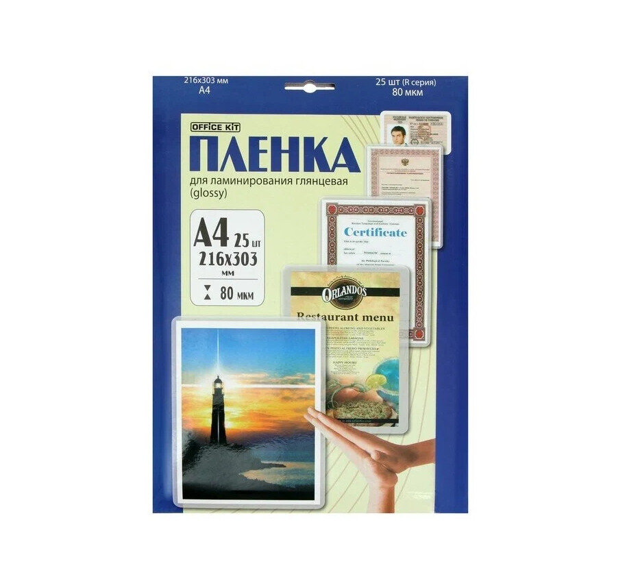 Пленка для ламинирования OFFICE KIT 80мкм 216х303 мм 25шт. глянцевая A4 LPA480