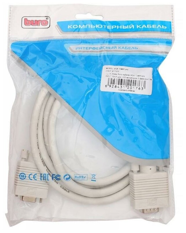 Кабель-удлинитель VGA BURO VGA HD15 (m) - VGA HD15 (f) ферритовый фильтр 1.8м серый CAB015S-06
