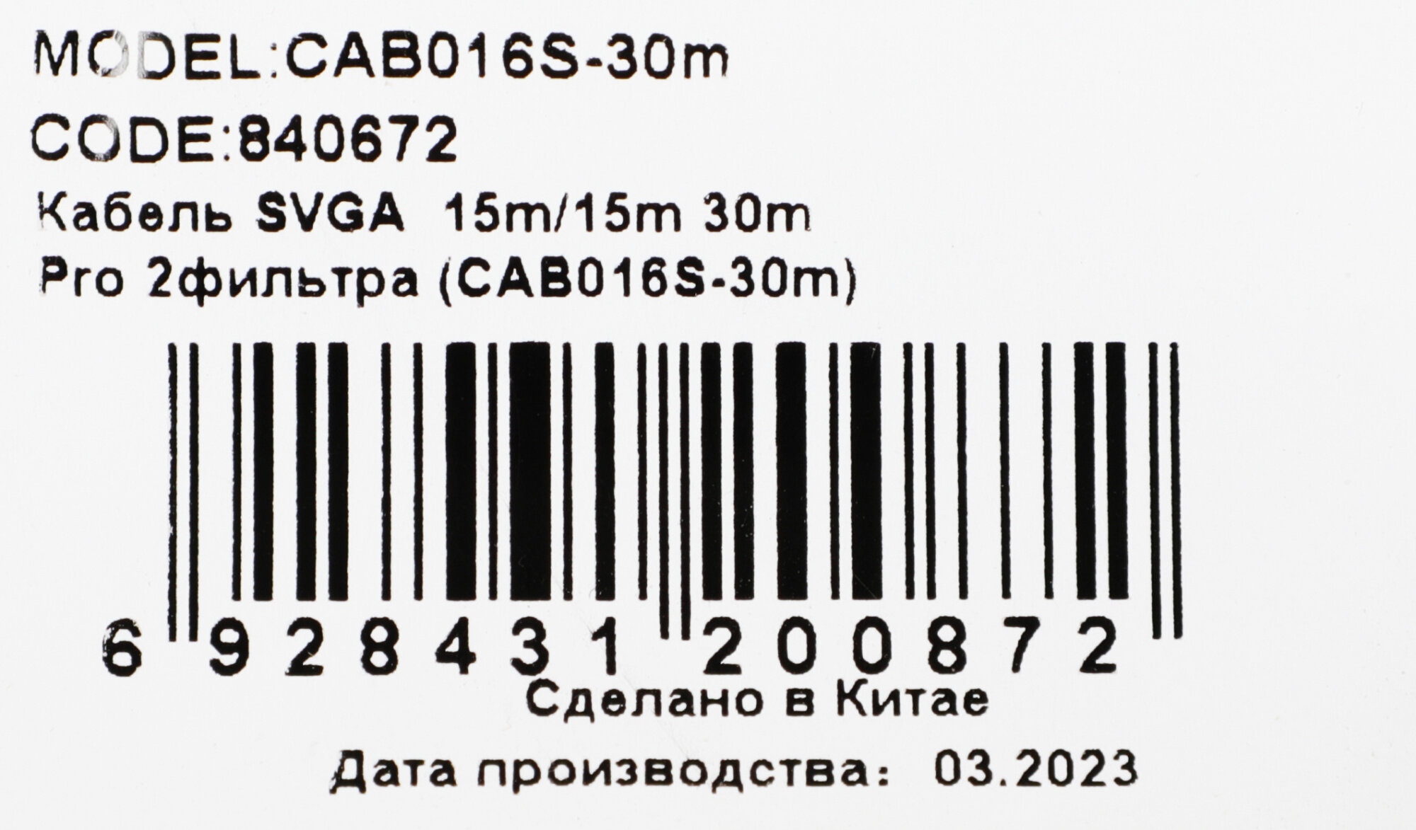 Кабель SVGA NINGBO CAB016S-30m VGA HD15 (m) - VGA HD15 (m) ферритовый фильтр 30м