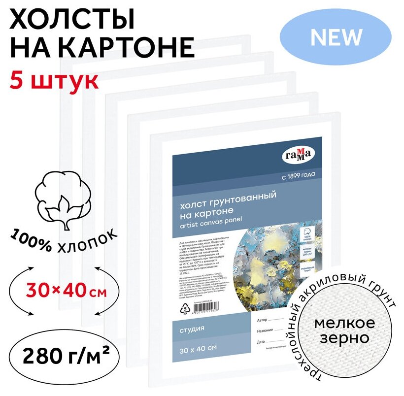 Набор холстов на картоне Студия 30х40 см 5 штук ГАММА