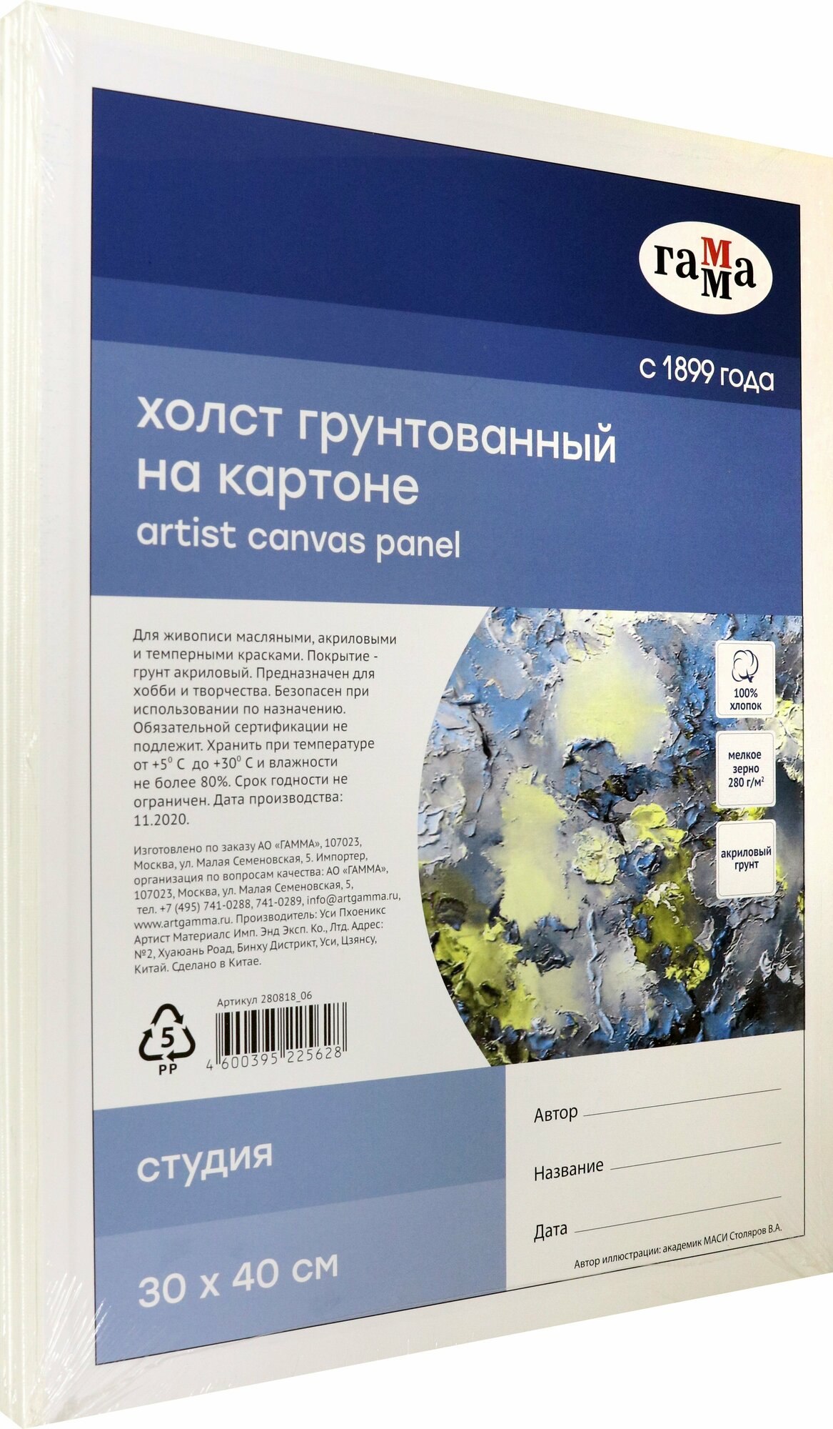 Хлопковый холст ГАММА серии "Студия", грунтованный на картоне, подойдёт для живописи масляными, акриловыми, темперными и гуашевыми красками. В наборе 5 холстов размером 30х40 см. Основа - натуральное полотно, 100% хлопок, мелкое зерно. Холст прямоугольной формы плотностью 280 г/м2. Холст покрыт акриловым грунтом. Изготовлен без использования кислот.