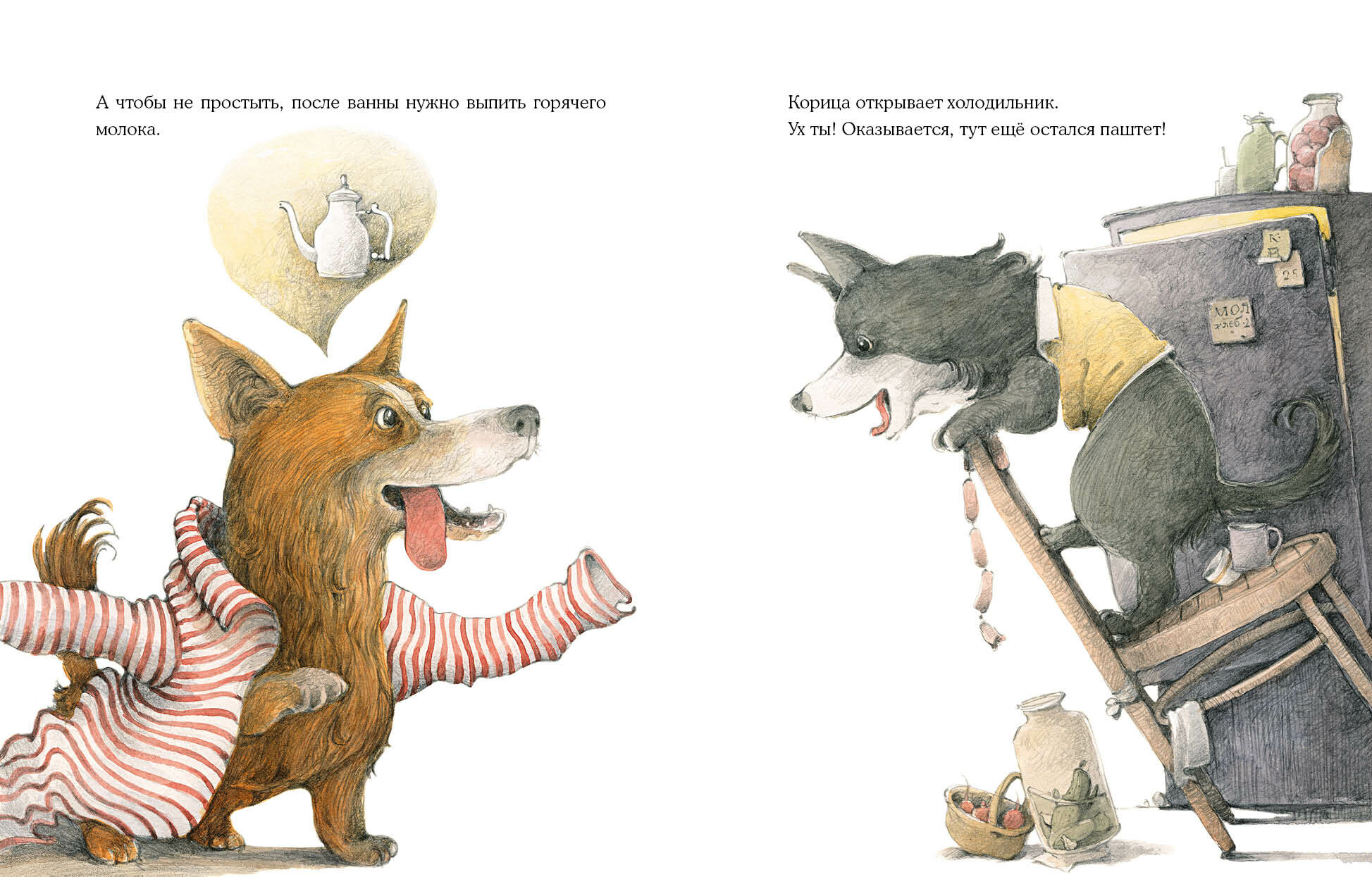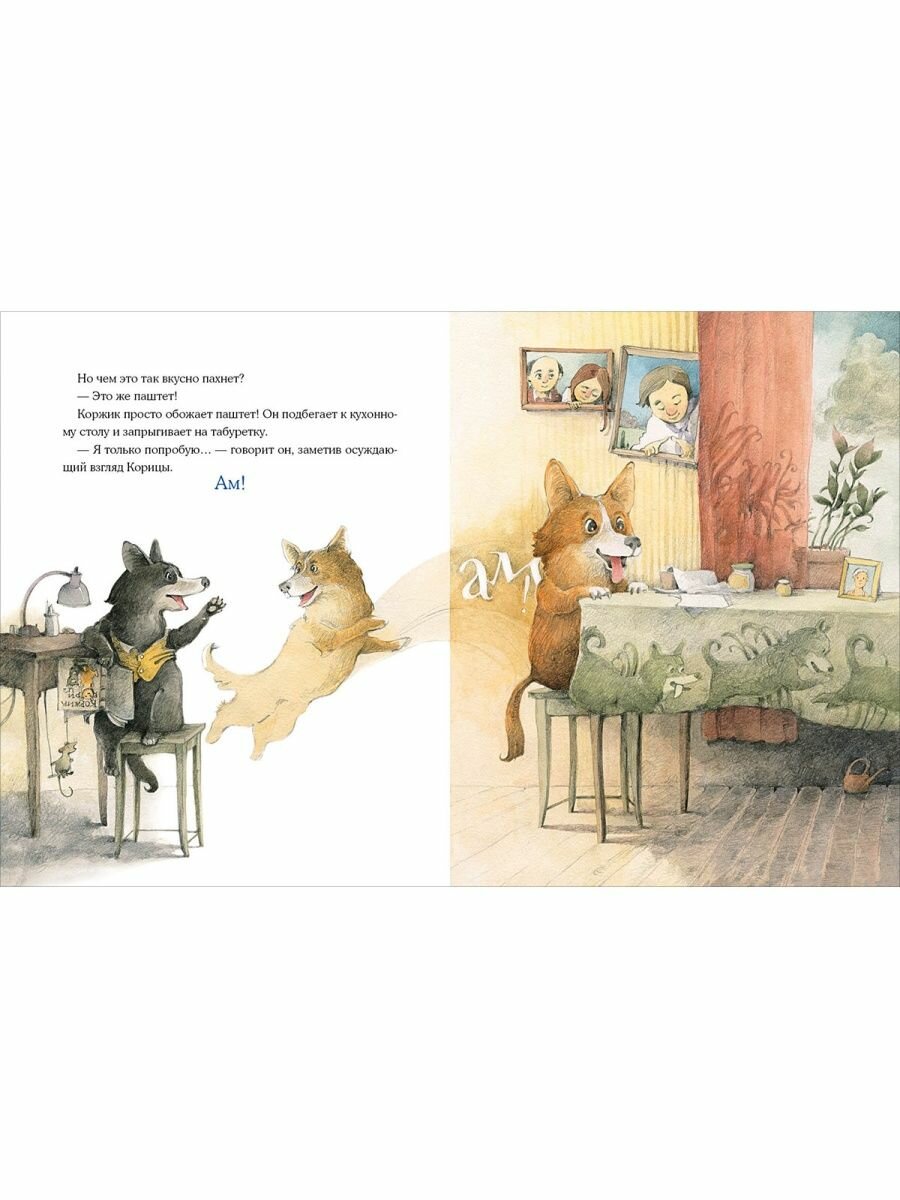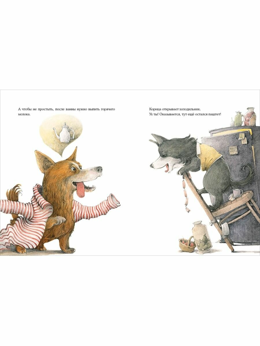 Однажды две весёлые собачки Коржик и Корица остались дома без хозяина. И что тут началось! Друзья полакомились паштетом, разбили цветочные горшки, разлили краску, да ещё и нашли применение хозяйской рубашке... И всё-таки они старались вести себя хорошо, хотя делать это одним им оказалось очень трудно!