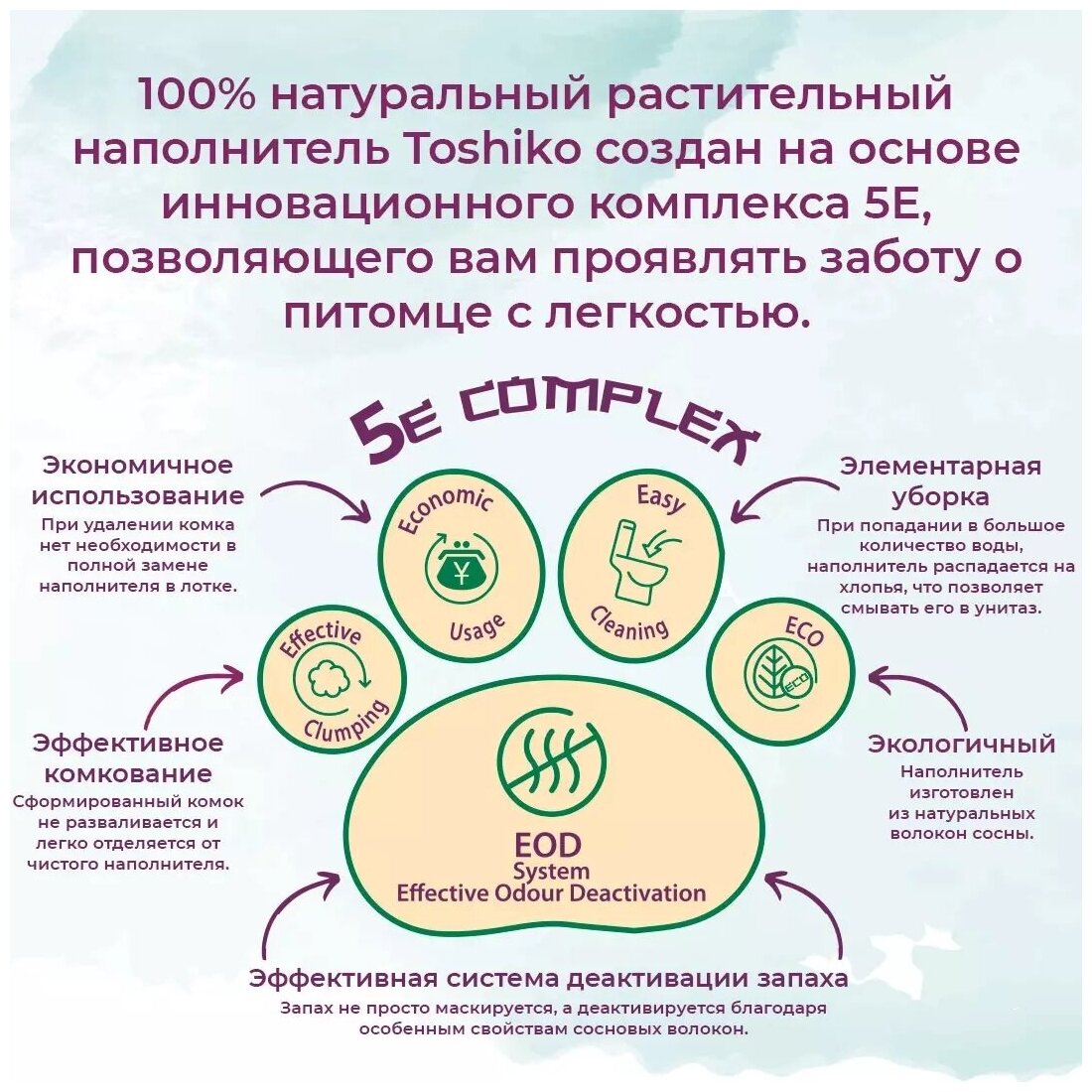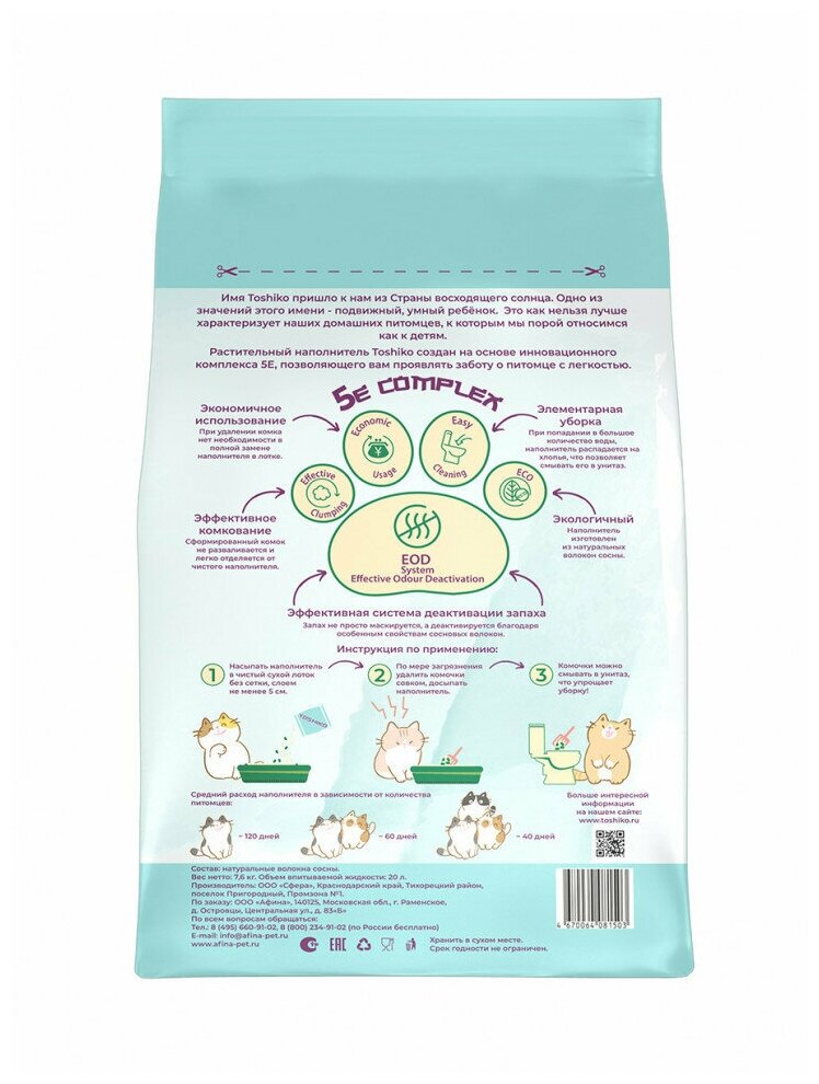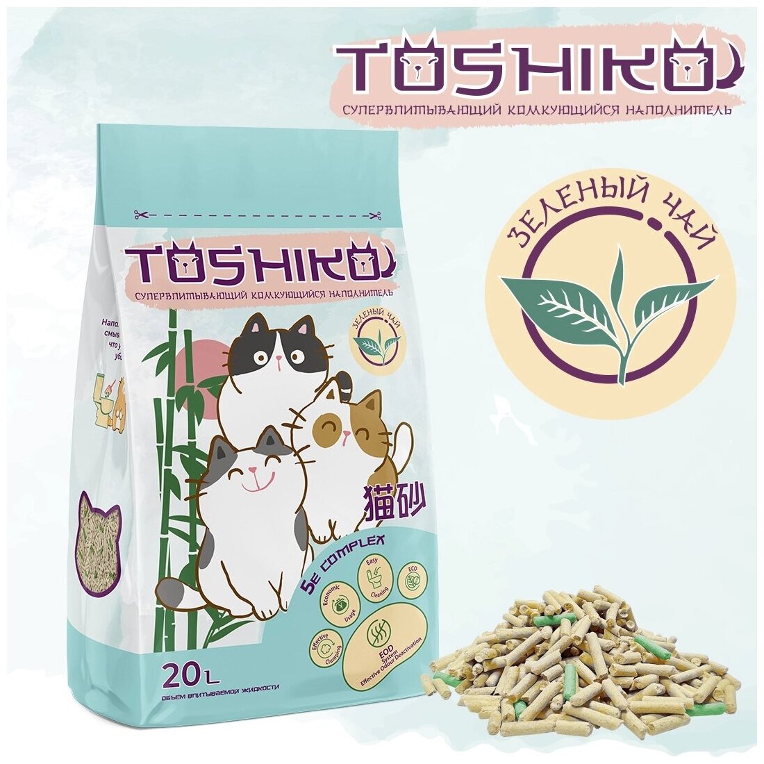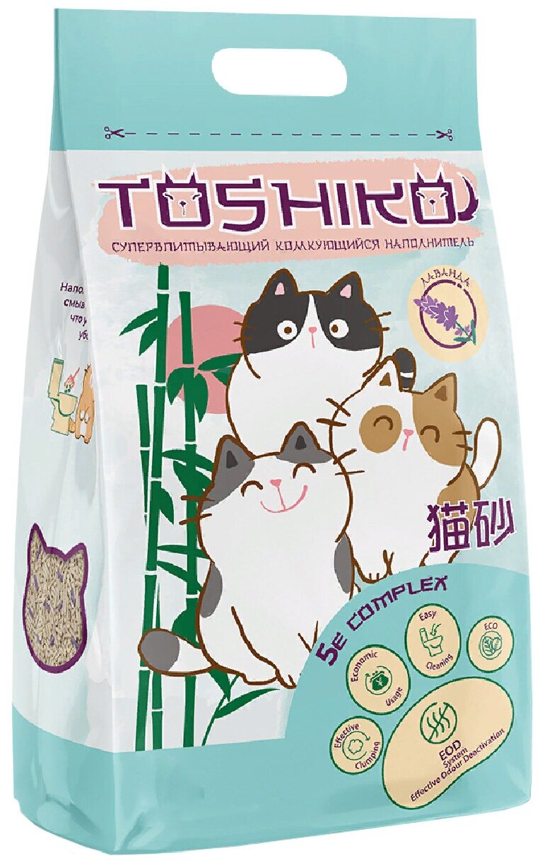 Имя Toshiko пришло к нам из страны восходящего солнца. Одно из значений этого имени – подвижный, умный ребёнок. Это как нельзя лучше характеризует наших домашних питомцев, к которым мы порой относимся как к детям. Растительный наполнитель Toshiko создан на основе инновационного комплекса 5E, позволяющего вам проявлять заботу о питомце с легкостью. При попадании жидкости он образовывает плотный комок, который можно утилизировать в канализацию - ведь при попадании в большое количество воды, комок распадется на хлопья и не приведет к засору. Toshiko Сакура обладает ненавязчивым ароматом японской вишни, а неприятные запахи не просто маскирует, а деактивирует.