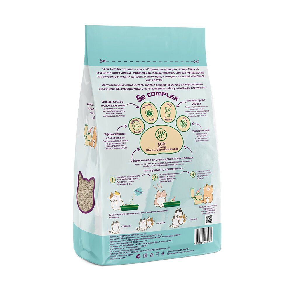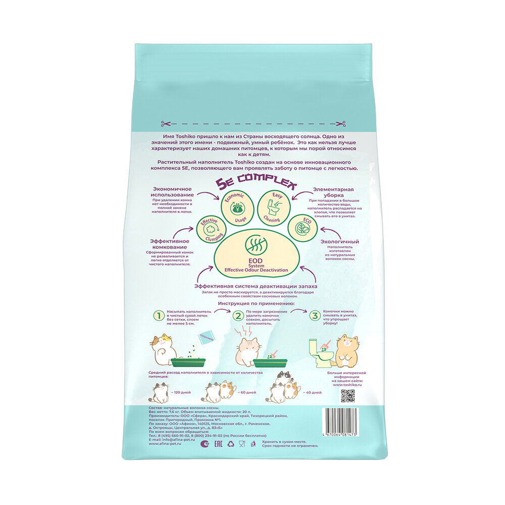Имя Toshiko пришло к нам из страны восходящего солнца. Одно из значений этого имени – подвижный, умный ребёнок. Это как нельзя лучше характеризует наших домашних питомцев, к которым мы порой относимся как к детям. Растительный наполнитель Toshiko создан на основе инновационного комплекса 5E, позволяющего вам проявлять заботу о питомце с легкостью. При попадании жидкости он образовывает плотный комок, который можно утилизировать в канализацию - ведь при попадании в большое количество воды, комок распадется на хлопья и не приведет к засору. Toshiko Натуральный обладает ненавязчивым древесным запахом, а неприятные запахи не просто маскирует, а деактивирует.