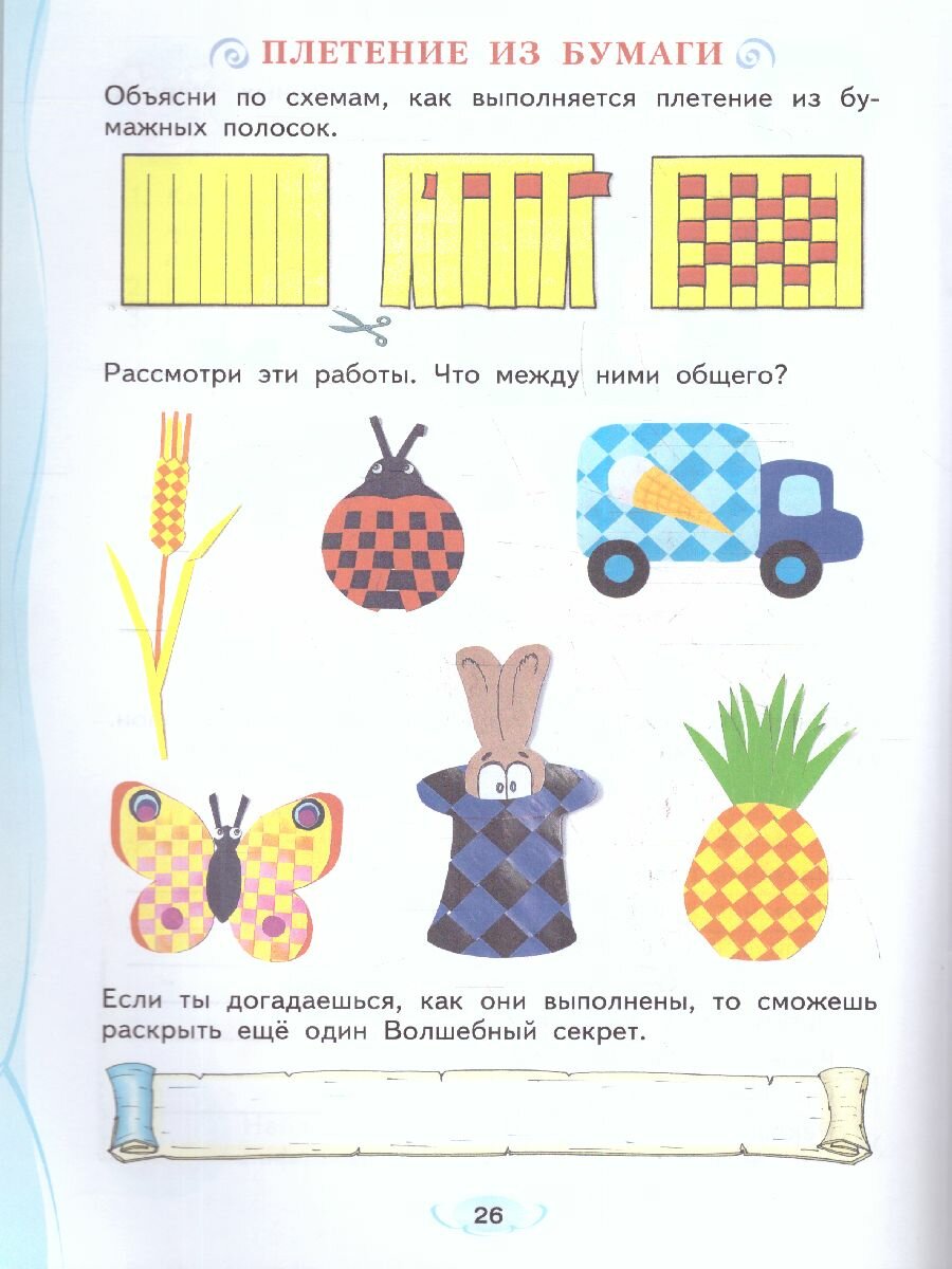 Рабочая тетрадь «Волшебные секреты» является учебным пособием по технологии для 2 класса. Работа с ней способствует развитию общеучебных умений и навыков: пространственного воображения, способности удержать цель деятельности, произвести самооценку своих достижений. Задания тетради направлены на развитие творческого мышления детей. В ходе занятий дети осваивают новые приемы плетения, работы с бумагой, выполняют композиции в технике оригами из квадратов и кругов. Страницы с цветной бумагой и выкройками предназначены для разрезания.