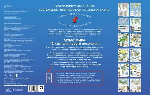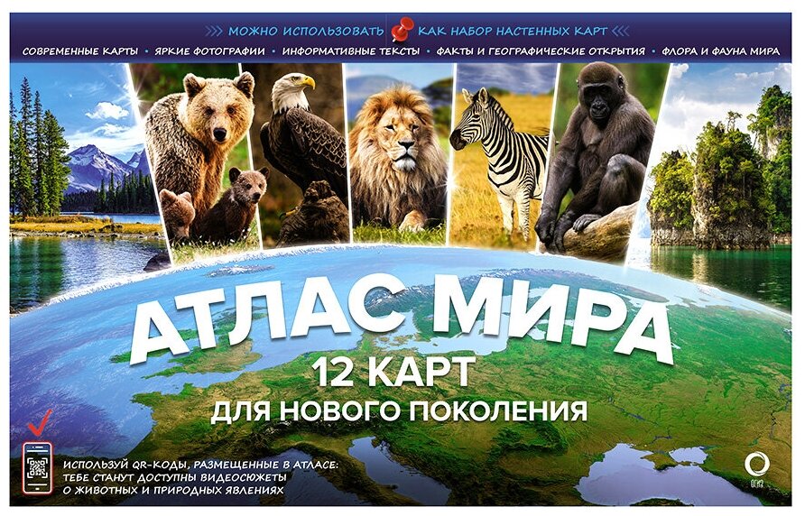 Хорошее пособие, подробный атлас, много карт. Яркие и красочные фотографии, на каждой странице есть несколько QR-кодов, которые можно считать через камеру телефона и открывается познавательное видео на YouTube по той или иной теме. Много карт с животными, обитающими в разных частях планеты. Ребенку больше понравилась искать флаги разных стран. Увлекательно и познавательно. Рекомендую к покупке.