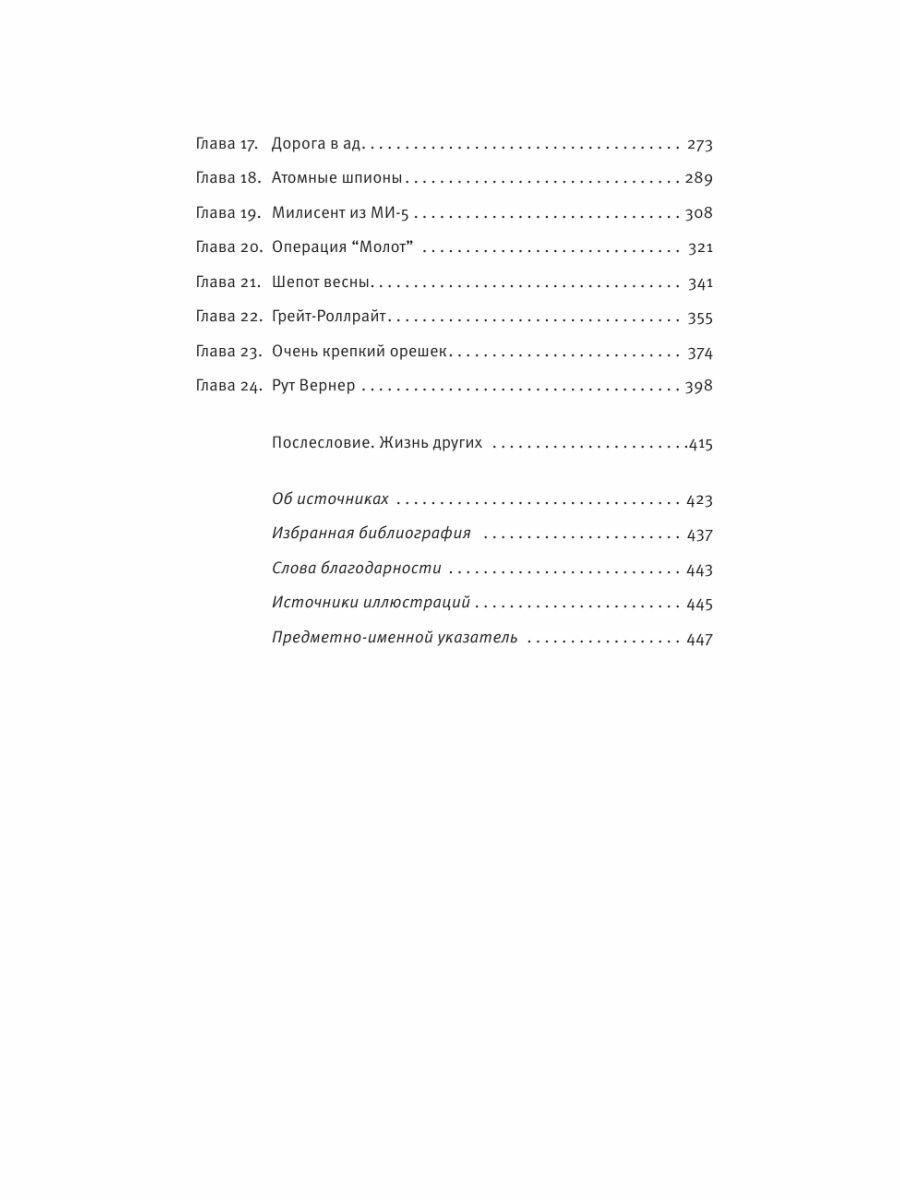 В книге показан весь путь Урсулы Кучински от простой подчиненной до опытной разведчицы. Бен Макинтайр мастерски раскрывает многогранность ее жизни и связанные с этим внутренние конфликты. Долг перед идеей и перед семьей, любовь и разлука, страх преследования и неутомимое жизнелюбие – все это составляет жизнь удивительной женщины, которой удалось сохранить себя в самом эпицентре катастроф двадцатого века.