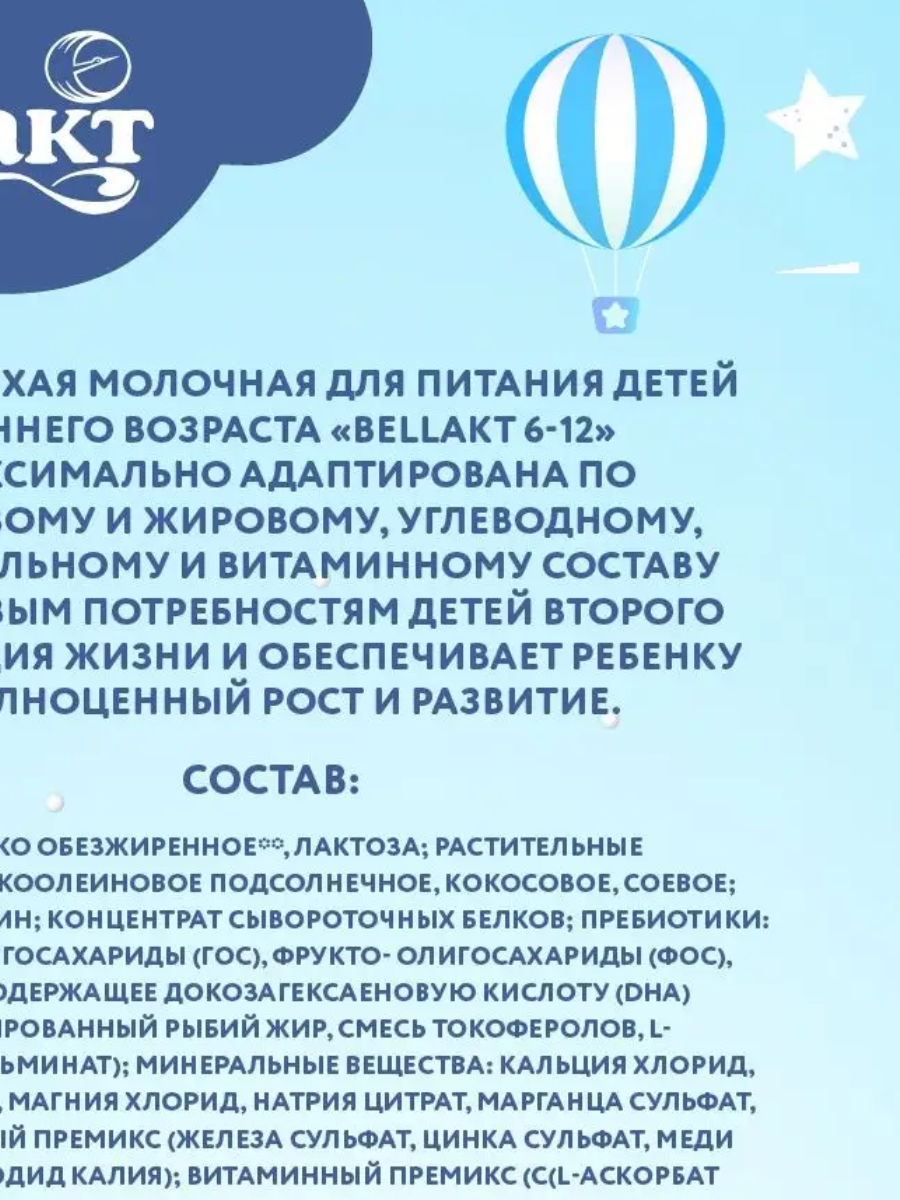 | Состав | молоко обезжиренное, лактоза, растительные масла (высокоолеиновое подсолнечное, кокосовое, соевое); концентрат сывороточных белков; пребиотики |