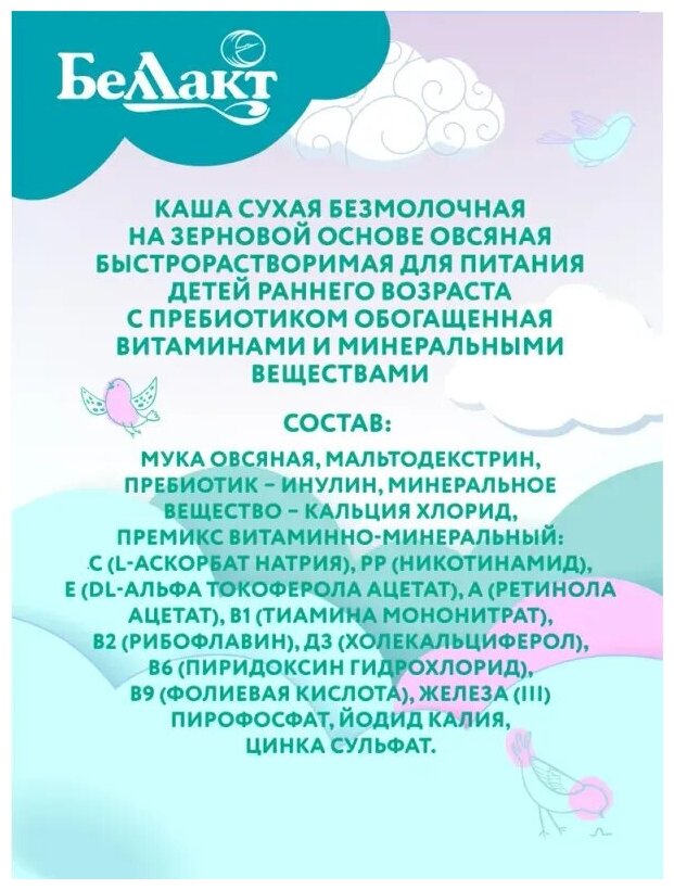 | Состав | мука овсяная; мальтодекстрин; пребиотик — инулин; минеральное вещество - кальция хлорид; премикс витаминно-минеральный |