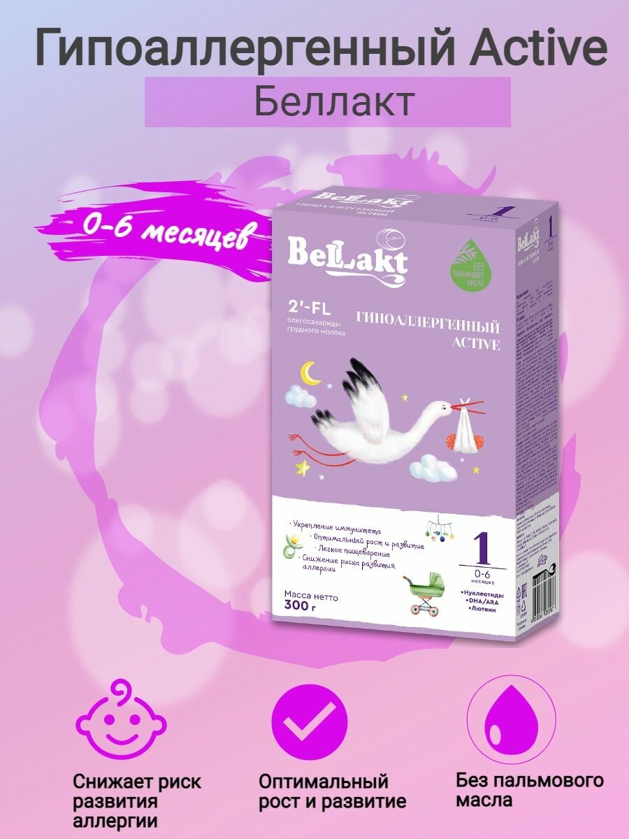 Детская смесь беллакт Рекомендуется для питания здоровых детей из группы риска по развитию пищевой аллергии с рождения до 6-ти месяцев. детская смесь беллакт содержит:· Частично гидролизованный белок, снижающий аллергенный потенциал смеси и способствующий формированию толерантности к белкам коровьего молока. Пребиотики ФОС способствуют развитию нормальной микробиоты кишечника. Олигосахариды 2’FL для поддержки иммунитета ребенка и формирования, защиты от инфекций. Комбинированный углеводный компонент (лактоза и мальтодекстрин), способствующий улучшению переваривания и усвоения. Нуклеотиды, необходимые для созревания нервной системы и иммунитета, роста и развития клеток слизистой кишечника. DHA и ARA – особые липиды, содержащиеся в грудном молоке и необходимые для полноценного развития иммунитета, мозга и органа зрения ребенка. Витамины, макро и микроэлементы, необходимые для оптимального роста и развития ребенка 1-го полугодия жизни. Без пальмового масла - уменьшение запоров и улучшение усвоения кальция. Олигосахариды 2?FL – новый уникальный компонент детских смесей с доказанными клиническими эффектами, которые схожи с функциональными эффектами олигосахаридов грудного молока. Олигосахариды 2?FL включены в углеводный компонент смеси: для формирования разнообразной полезной кишечной микробиоты; для поддержки иммунитета ребенка и снижения риска развития аллергии; для защиты от инфекций; ·для улучшения процессов пищеварения. Благодаря своему составу смесь « Беллакт Гипоаллергенный Active 1» обеспечивает: Снижение сенсибилизации к аллергенам. Формирование пищевой толерантности. Укрепление иммунитета, снижение риска развития IgE-связанных реакций. Оптимальный рост и развитие ребенка.