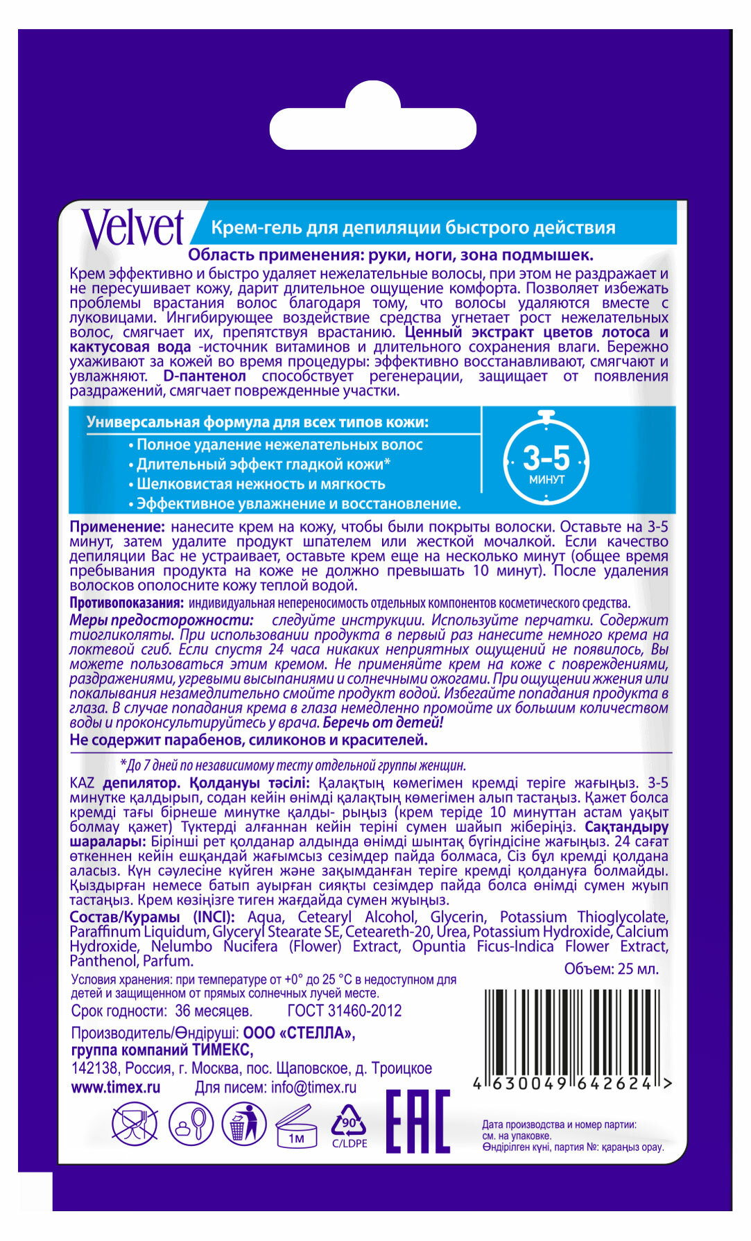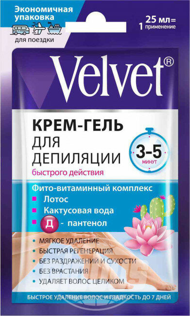 VELVET Крем-гель для депиляции быстрого действия 25 мл Крем эффективно и быстро удаляет нежелательные волосы, при этом не раздражает и не пересушивает кожу, дарит длительное ощущение комфорта. Позволяет избежать проблемы врастания волос благодаря тому, что волосы удаляются вместе с луковицами. Ингибирующее воздействие средства угнетает рост нежелательных волос, смягчает их, препятствуя врастанию. Ценный экстракт цветов лотоса и кактусовая вода -источник витаминов и длительного сохранения влаги. Бережно ухаживают за кожей во время процедуры: эффективно восстанавливают, смягчают и увлажняют. D-пантенол способствует регенерации, защищает от появления раздражений, смягчает поврежденные участки. Универсальная формула для всех типов кожи: -Полное удаление нежелательных волос. -Длительный эффект гладкой кожи. -Шелковистая нежность и мягкость. -Эффективное увлажнение и восстановление.