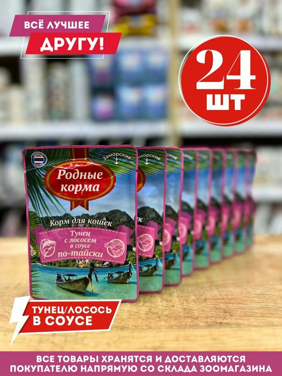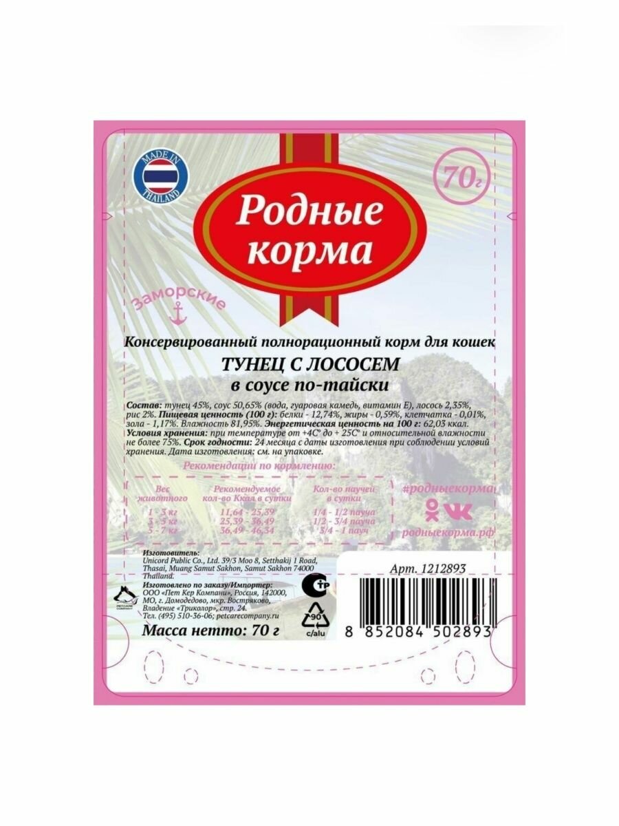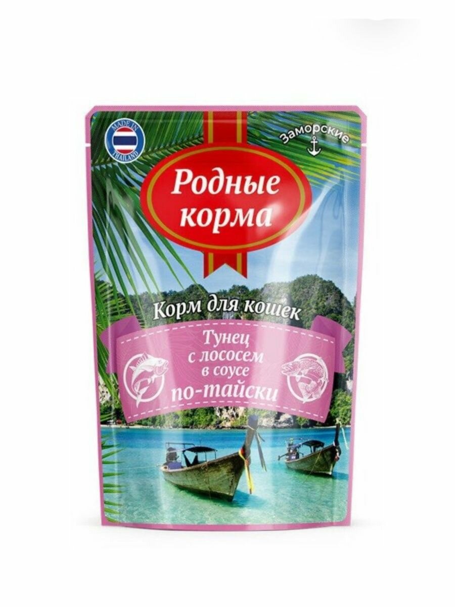 Влажный корм для кошек Родные корма Заморские Тунец с лососем в соусе по-тайски 70г