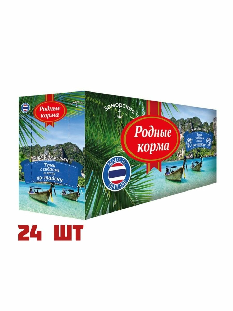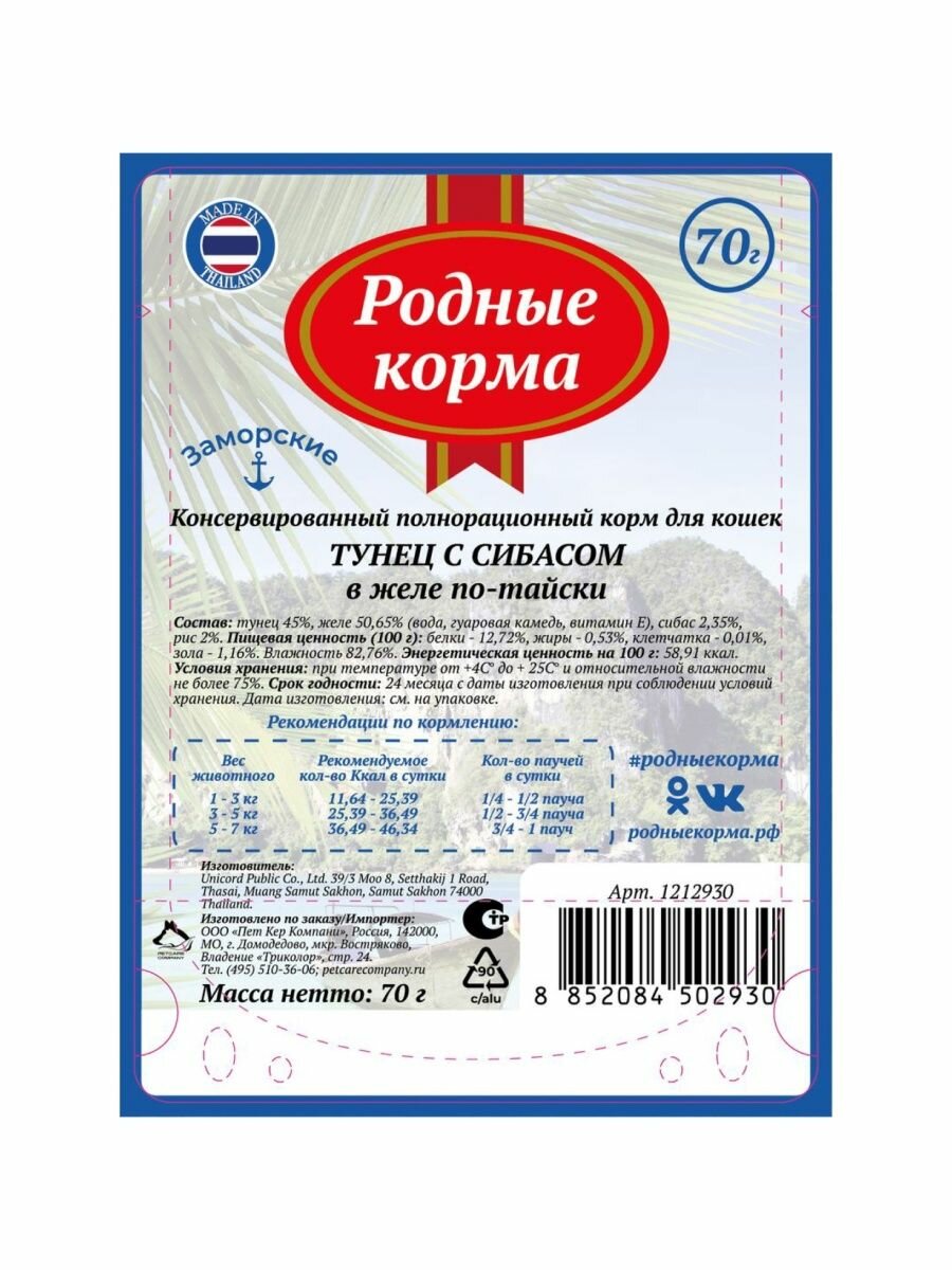 Влажный корм для кошек Родные корма Заморские Тунец с сибасом в желе по-тайски 70г по-тульски