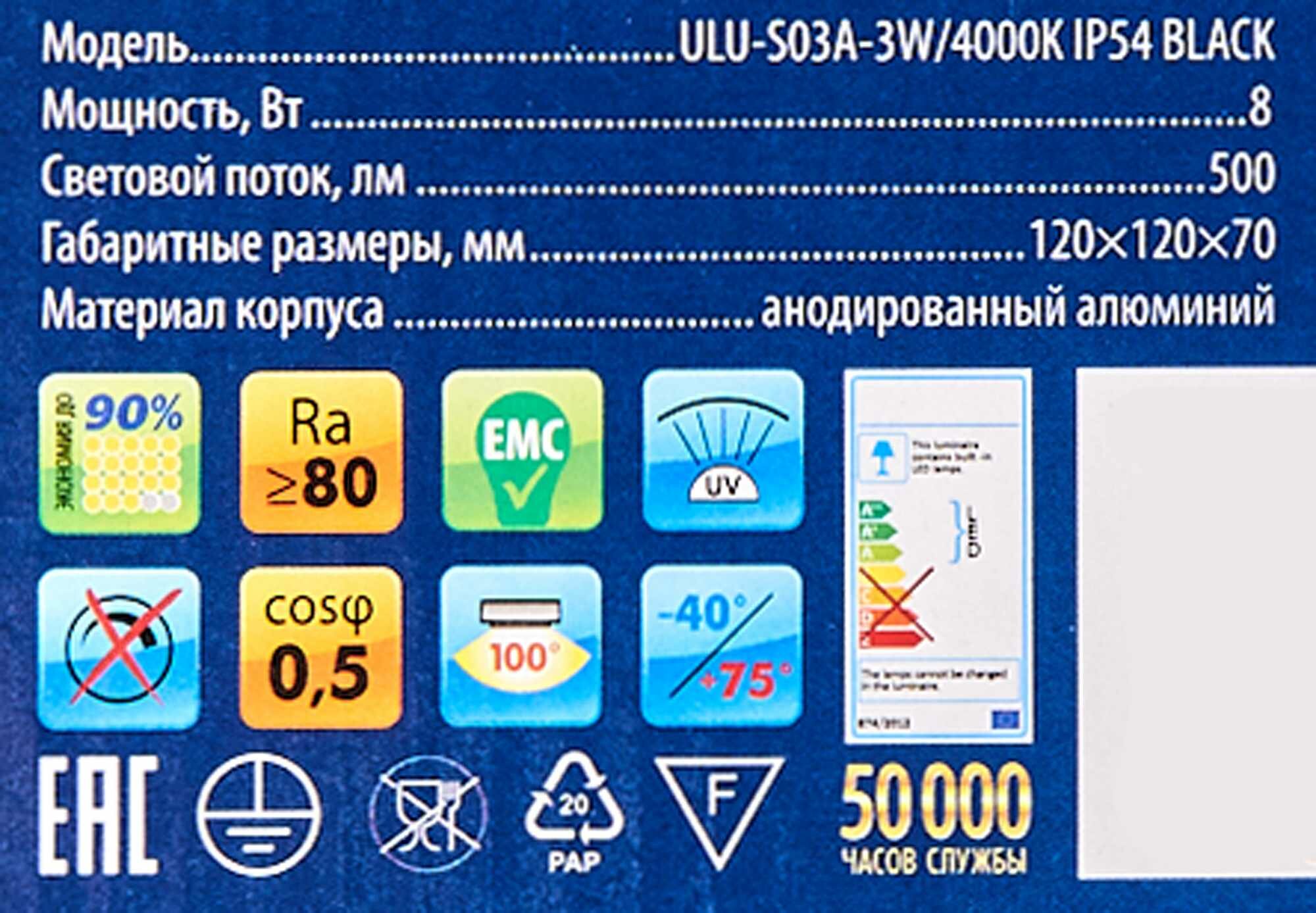 | Артикул | ULU-S50A-8W/4000K IP65 Black |
