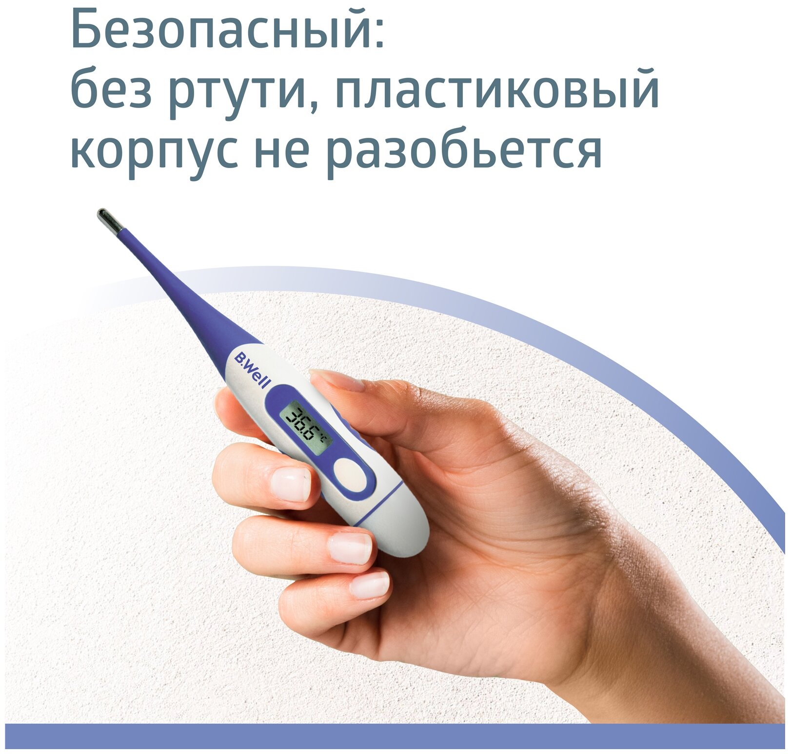 Медицинский термометр B.Well заменит ртутный градусник в Вашей аптечке. В отличие от ртутного прибора, электронный термометр B.Well абсолютно безопасен, он не содержит ртути и стекла, будет удобен для детей и взрослых, его просто взять в дорогу. Как и все семейные электронные термометры B.Well имеет сменный элемент питания и влагозащищенную конструкцию. Модель отличается повышенным комфортом, имеет гибкий наконечник и противоскользящие вставки.