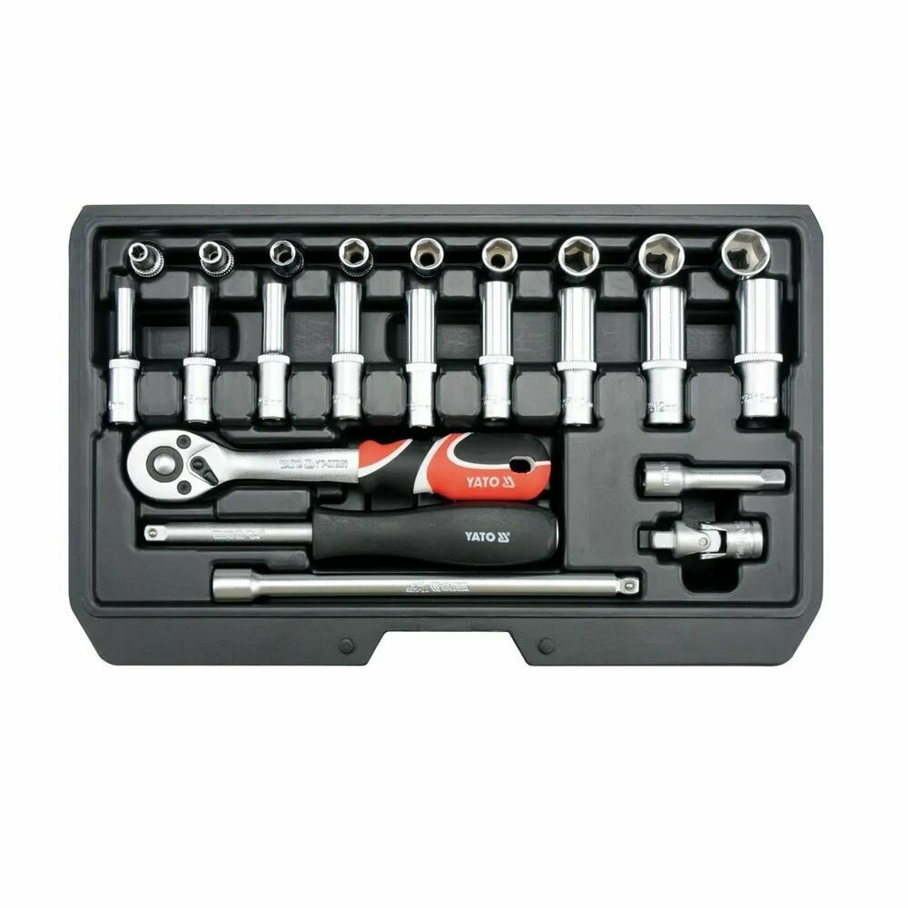 Набор инструментов профессионального качества Yato, рекомендуемый для сервисных центров и мастерских. Торцевые ключи и привод головок изготовлены из прочной инструментальной хромованадиевой стали CrV 50BV30. Головки, оснащенные системой AS-Drive, увеличивающей максимальный крутящий момент на 25%, с полной защитой обода гаек, головки с двухцветной отделкой поверхности. трещотка имеет трехкомпонентную ручку и 72 зубца (рабочий ход 5 градусов).Количество элементов: 23 шт.Материал: CrV6140, CrV50BV30.Размер головок: 4-13 мм.Посадочный квадрат: 1/4" (6.3 мм).