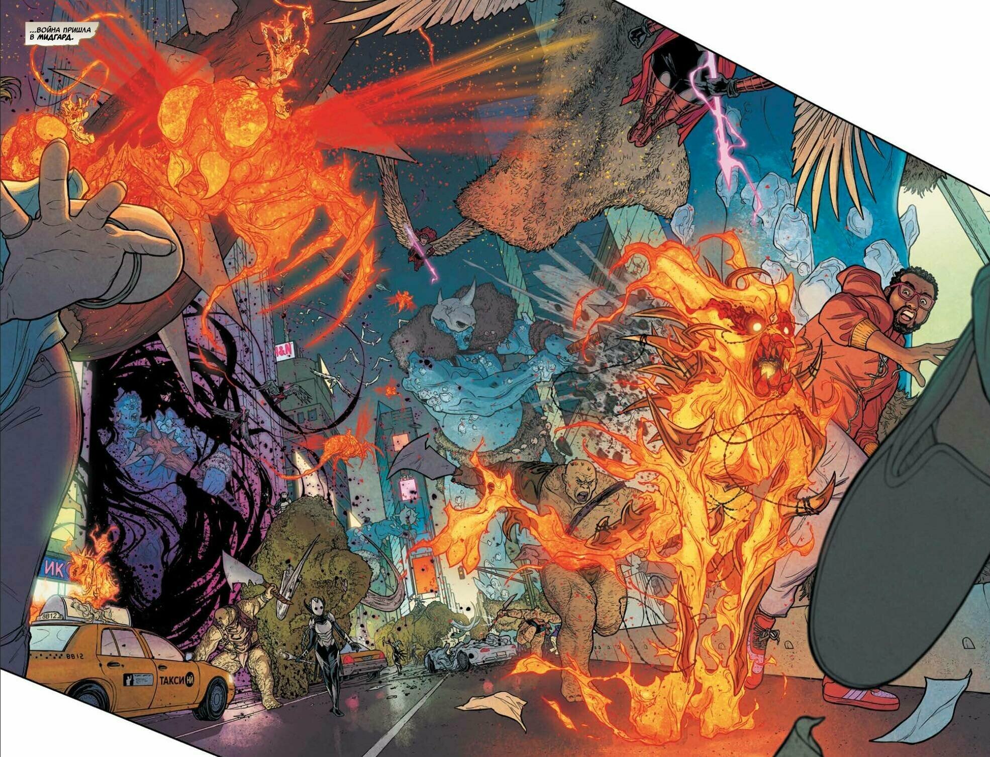 Неизбежное глобальное событие Марвел, начало которому было положено ещё в ране Аарона Тор Бог грома и парочкой продолжений. Завязка простая, впрочем, как и сюжет (будем честны, все глобалки отднотипны), всё весьма шаблонно и просто, но! На мой взгляд это единственный глобальный комикс, который подан с весельем, а команды "нападающих" и "отбивающих", по-настоящему разношерстные. С одной стороны нас ждут гоблины, тролли, великаны, какие-то гончие псы, и разного рода фэнтезийные создания, которые буквально заполонили землю, а с другой привычные герои Марвел (и вот тут самое главное), на подхвате у которых те самые антигерои, которые в последнее время начали приобретать популярность в нашей стране и играют они весьма значительную роль, а некоторым так вообще тай-ины этого события посвящены. Несмотря на хаос, правильная командная расстановка персонажей работает, отвлекая от трагичности, время за чтением пролетает быстро, хоть финал и притянут за уши (здесь Аарон самоповторяется). От всего того, что творится на страницах комикса приятно сводит глаза, в купе с прекрасной рисовкой динамика действительно поражает, ведь колористы уделили внимание каждой детали, окрасив объекты мягкими оттенками всех цветов радуги, не выходя за границы штрихов, напоминая смесь цветного карандаша и гуаши. Тем кто скучал по приключениям Тора и красивым долгожданным Событиям Марвел, комикс однозначно к покупке.