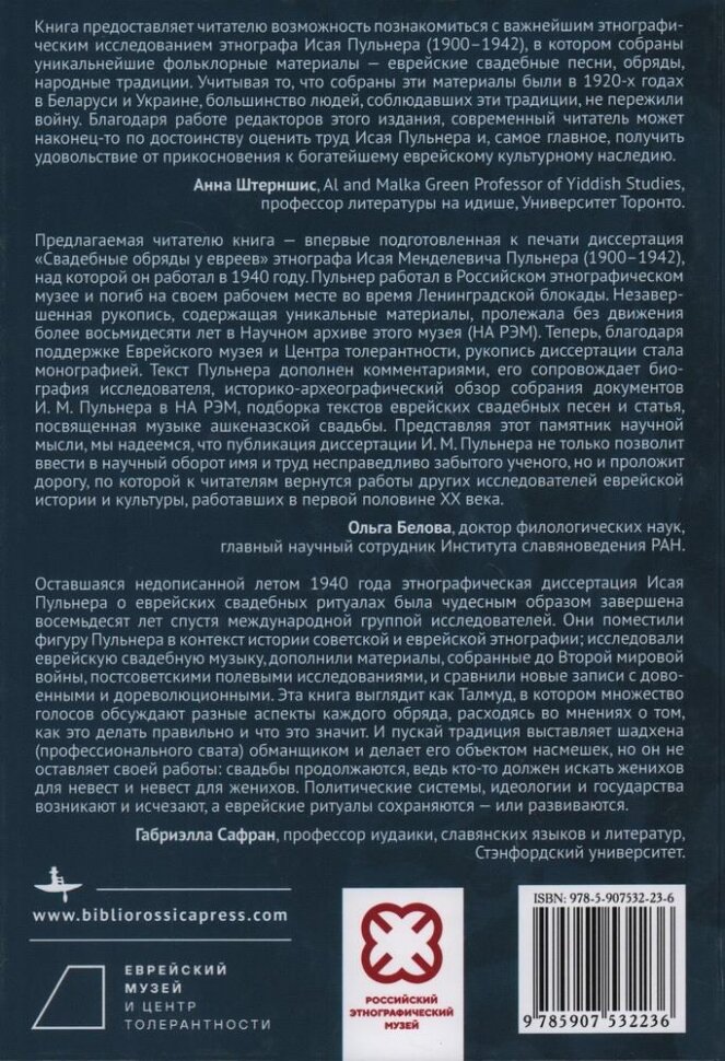 Теперь, благодаря поддержке Еврейского музея и Центра толерантности, рукопись диссертации стала монографией. Текст Пульнера дополнен комментариями, его сопровождает биография исследователя, историко-археографический обзор собрания документов И.М. Пульнера в НА РЭМ, подборка текстов еврейских свадебных песен и статья, посвященная музыке ашкеназской свадьбы.