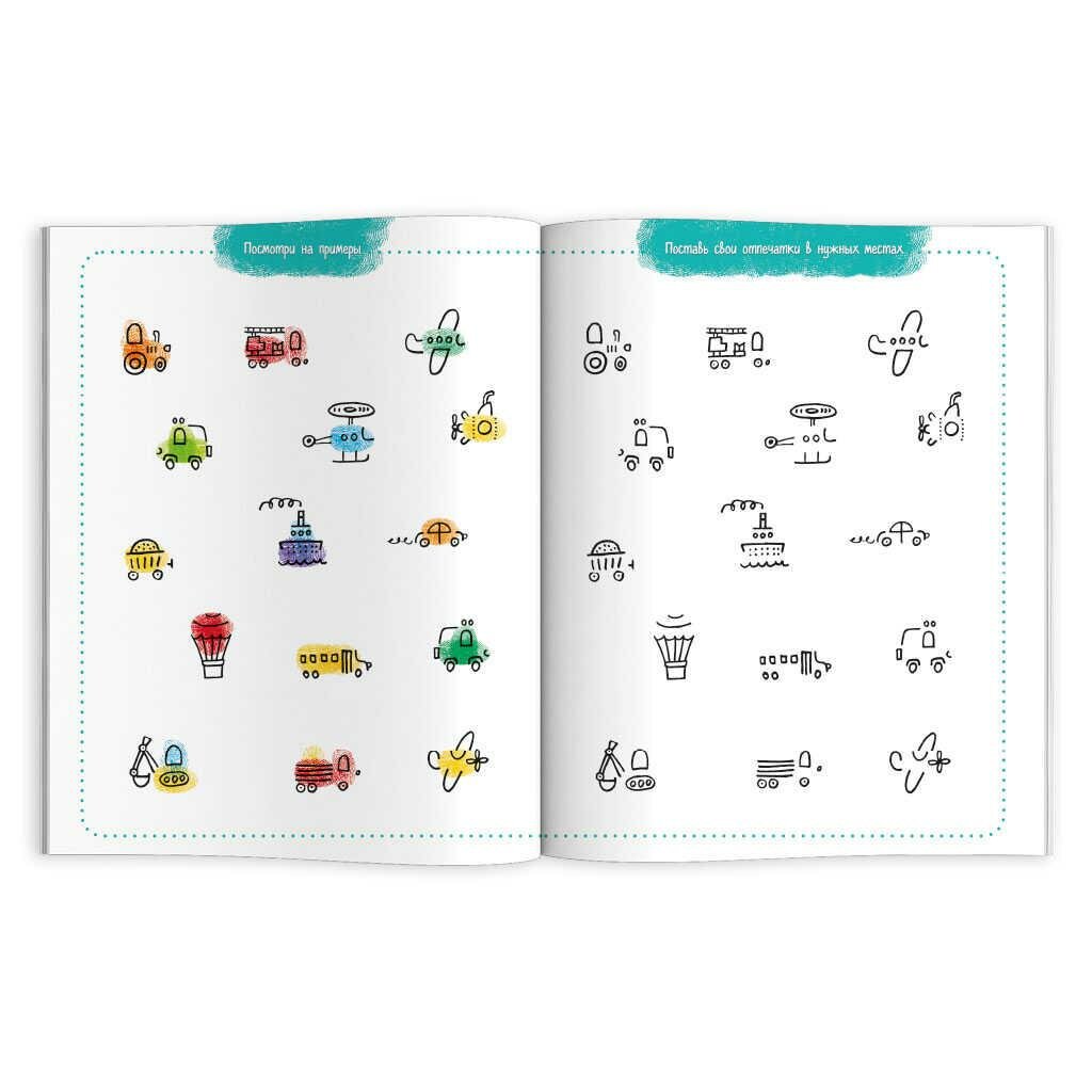 Рисуем отпечатками пальчиков! Как только малыш окунает пальчик в краску, страница оживает. Вдруг начинает тарахтеть трактор, рычит лев, приветливо хлопает ушами слон, а пчела жужжит над ярким цветком. Внутри ребёнка ждут разные типы заданий. Можно украсить большой рисунок или дополнить забавный эскиз отпечатками. Пошаговая схема подскажет, как создать собственных весёлых героев.