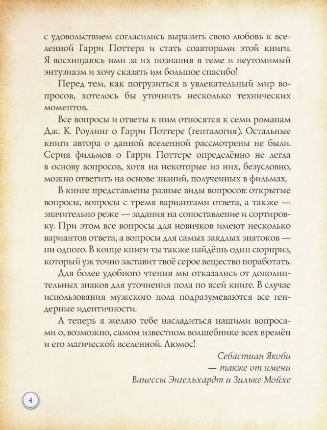Подойдет тем, кто любит проводить тематические вечеринки и что-то подобное, квест или викторины на разные темы. Книга позволит оценить Ваши знания по миру Гарри Поттера. Для детей и взрослых. Устройте себе Train-Brain по знаниям книг и фильмов о Гарри Поттере с друзьями или просто почитайте и проверьте себя в одиночестве.