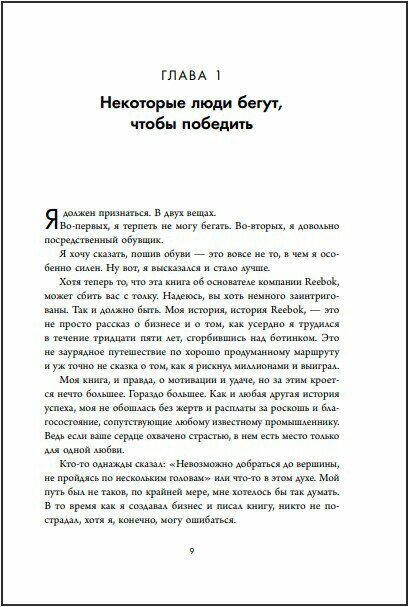 Я хочу сказать, что пошив обуви — вовсе не то, в чем я особенно силен. Ну вот, я высказался, и стало лучше. Хотя теперь тот факт, что эта книга об основателе компании Reebok, может сбить вас с толку. Надеюсь, вы также немного заинтригованы. Так и должно быть».